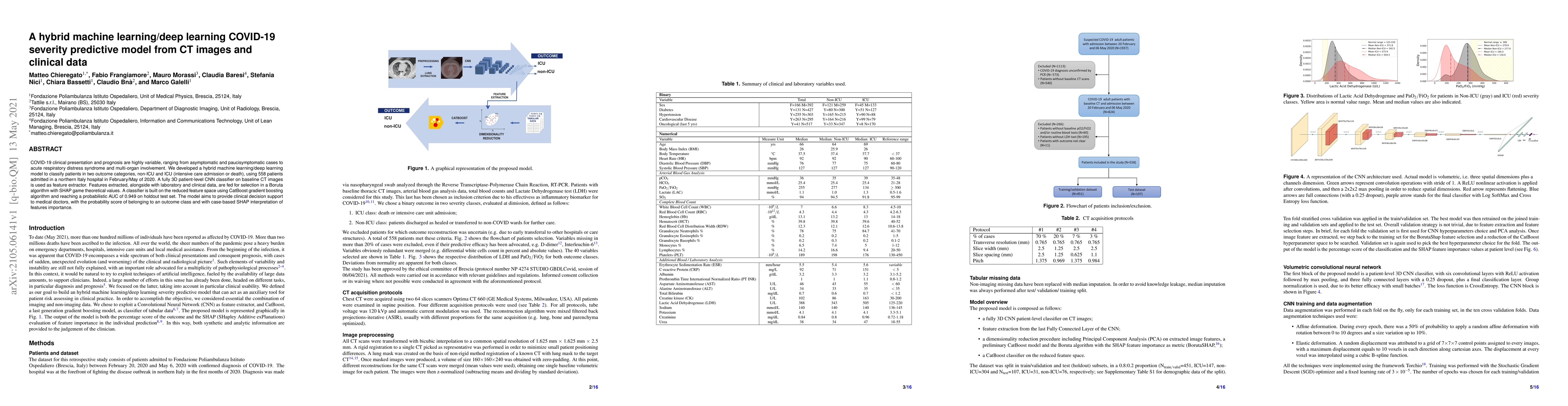 COVID-19 clinical presentation and prognosis are highly variable, ranging from asymptomatic and paucisymptomatic cases to acute respiratory distress syndrome and multi-organ involvement. We developed a hybrid machine learning/deep learning model to classify patients in two outcome categories, non-ICU and ICU (intensive care admission or death), using 558 patients admitted in a northern Italy hospital in February/May of 2020. A fully 3D patient-level CNN classifier on baseline CT images is used as feature extractor. Features extracted, alongside with laboratory and clinical data, are fed for selection in a Boruta algorithm with SHAP game theoretical values. A classifier is built on the reduced feature space using CatBoost gradient boosting algorithm and reaching a probabilistic AUC of 0.949 on holdout test set. The model aims to provide clinical decision support to medical doctors, with the probability score of belonging to an outcome class and with case-based SHAP interpretation of features importance.