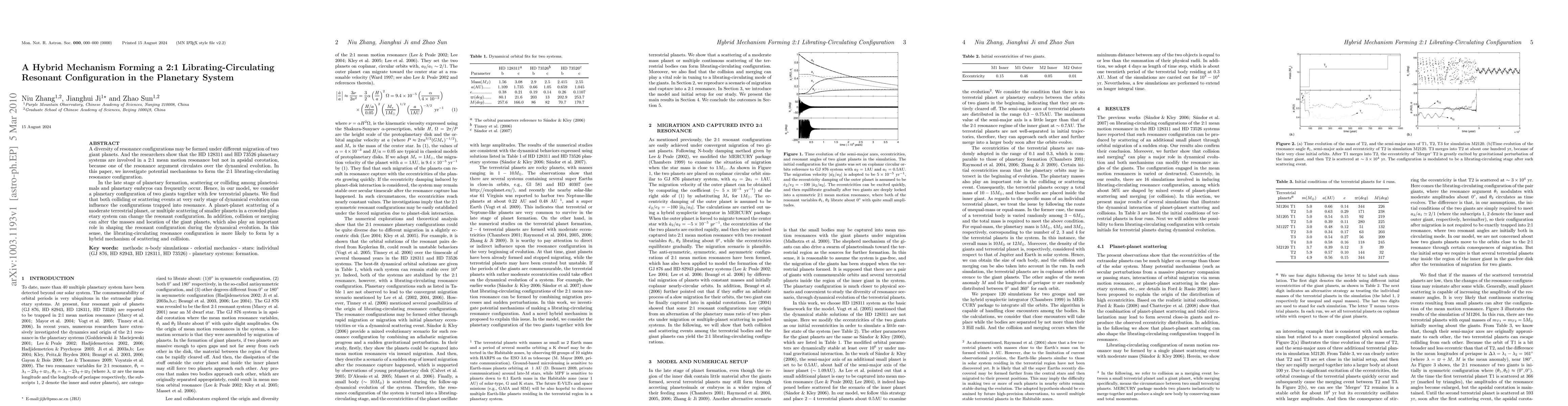 A diversity of resonance configurations may be formed under different migration of two giant planets. And the researchers show that the HD 128311 and HD 73526 planetary systems are involved in a 2:1 mean motion resonance but not in apsidal corotation, because one of the resonance argument circulates over the dynamical evolution. In this paper, we investigate potential mechanisms to form the 2:1 librating-circulating resonance configuration. In the late stage of planetary formation, scattering or colliding among planetesimals and planetary embryos can frequently occur. Hence, in our model, we consider a planetary configuration of two giants together with few terrestrial planets. We find that both colliding or scattering events at very early stage of dynamical evolution can influence the configurations trapped into resonance. A planet-planet scattering of a moderate terrestrial planet, or multiple scattering of smaller planets in a crowded planetary system can change the resonant configuration. In addition, collision or merging can alter the masses and location of the giant planets, which also play an important role in shaping the resonant configuration during the dynamical evolution. In this sense, the librating-circulating resonance configuration is more likely to form by a hybrid mechanism of scattering and collision.