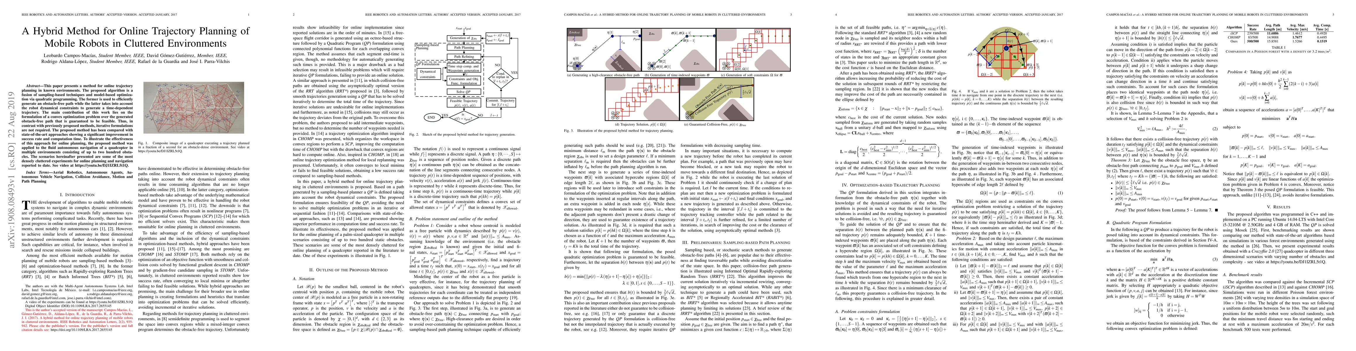 This paper presents a method for online trajectory planning in known environments. The proposed algorithm is a fusion of sampling-based techniques and model-based optimization via quadratic programming. The former is used to efficiently generate an obstacle-free path while the latter takes into account the robot dynamical constraints to generate a time-dependent trajectory. The main contribution of this work lies on the formulation of a convex optimization problem over the generated obstacle-free path that is guaranteed to be feasible. Thus, in contrast with previously proposed methods, iterative formulations are not required. The proposed method has been compared with state-of-the-art approaches showing a significant improvement in success rate and computation time. To illustrate the effectiveness of this approach for online planning, the proposed method was applied to the fluid autonomous navigation of a quadcopter in multiple environments consisting of up to two hundred obstacles. The scenarios hereinafter presented are some of the most densely cluttered experiments for online planning and navigation reported to date. See video at https://youtu.be/DJ1IZRL5t1Q