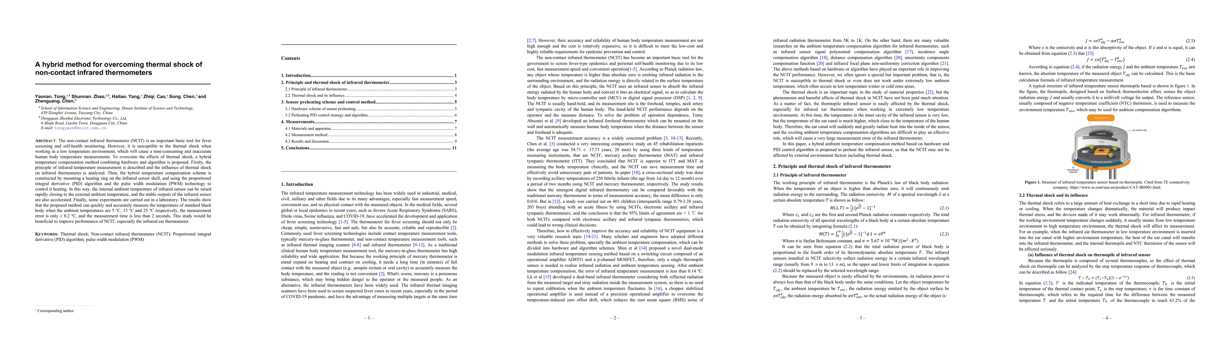 The non-contact infrared thermometer (NCIT) is an important basic tool for fever screening and self-health monitoring. However, it is susceptible to the thermal shock when working in a low temperature environment, which will cause a time-consuming and inaccurate human body temperature measurements. To overcome the effects of thermal shock, a hybrid temperature compensation method combining hardware and algorithm is proposed. Firstly, the principle of infrared temperature measurement is described and the influence of thermal shock on infrared thermometer is analyzed. Then, the hybrid temperature compensation scheme is constructed by mounting a heating ring on the infrared sensor shell, and using the proportional integral derivative (PID) algorithm and the pulse width modulation (PWM) technology to control it heating. In this way, the internal ambient temperature of infrared sensor can be raised rapidly closing to the external ambient temperature, and the stable outputs of the infrared sensor are also accelerated. Finally, some experiments are carried out in a laboratory. The results show that the proposed method can quickly and accurately measure the temperature of standard black body when the ambient temperatures are 5 , 15 and 25 Celsius respectively, the measurement error is only 0.2 Celsius , and the measurement time is less than 2 seconds. This study would be beneficial to improve performance of NCIT, especially the infrared ear thermometer.