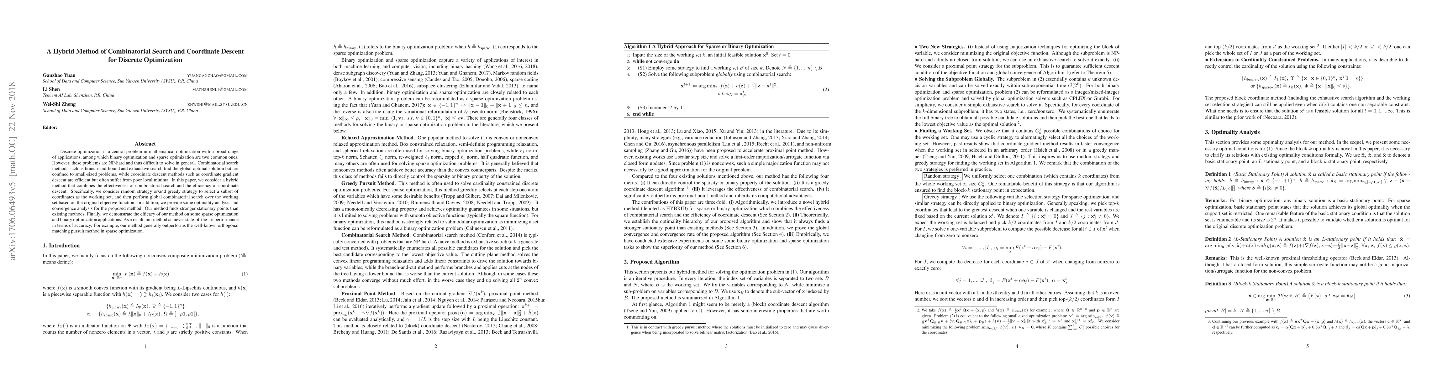 This paper proposes a hybrid method combining combinatorial search and coordinate descent for discrete optimization, achieving state-of-the-art performance in sparse and binary optimization by leveraging global search on a subset of coordinates and providing strong optimality and convergence analysis.
