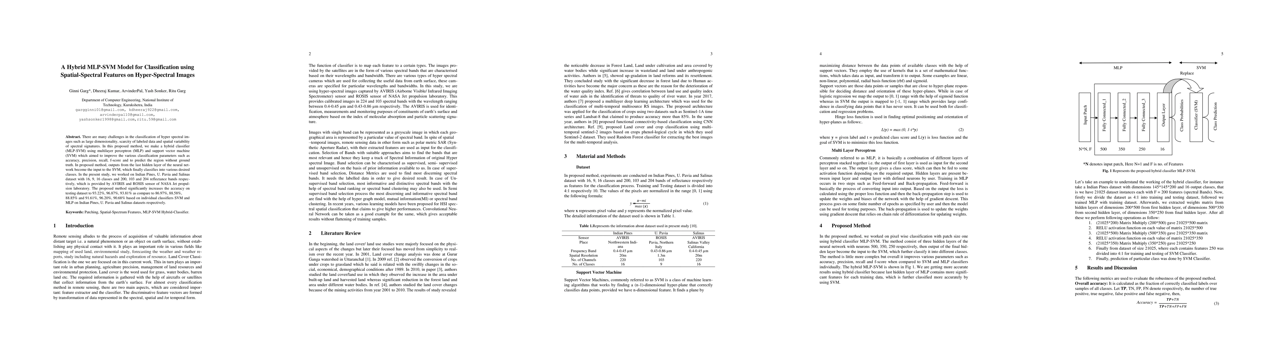 A hybrid MLP-SVM model improves classification accuracy on hyper-spectral images by combining spatial and spectral features, achieving higher results than individual classifiers.