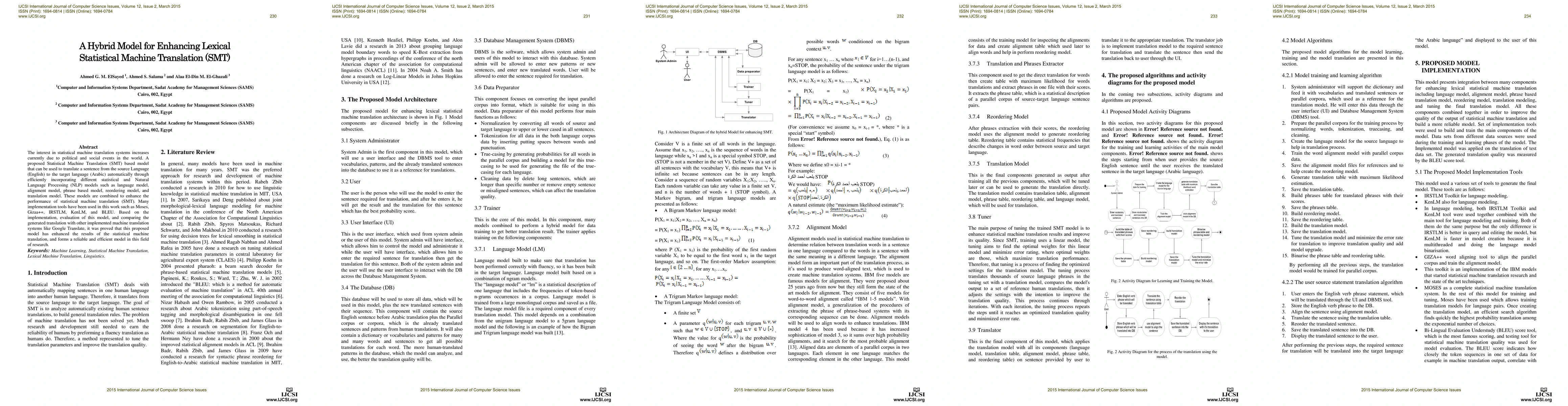 This paper proposes a hybrid Statistical Machine Translation (SMT) model that combines various statistical and NLP models to enhance translation from English to Arabic. Evaluations using tools like Moses, Giza++, and BLEU show improved performance compared to systems like Google Translate.