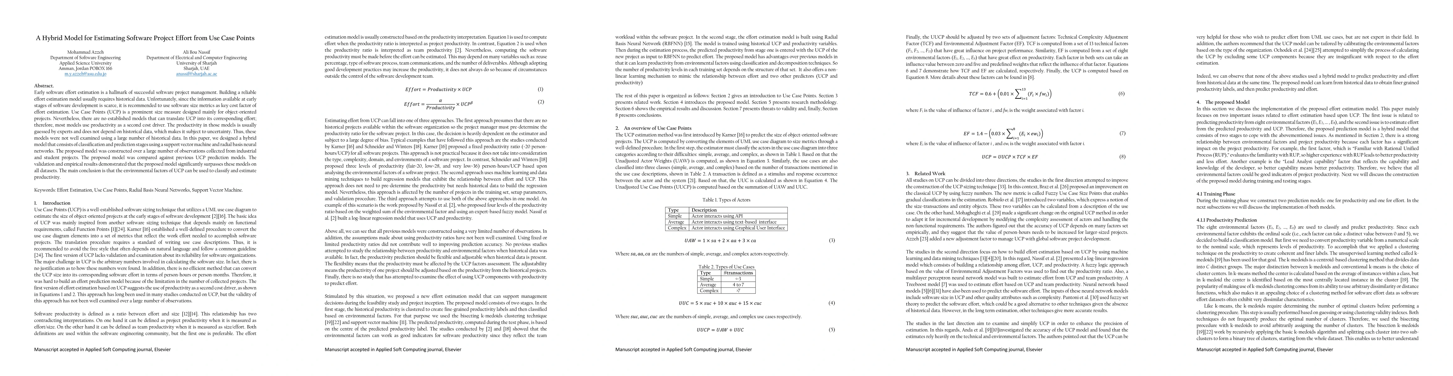This paper proposes a hybrid model combining classification and prediction stages using support vector machines and radial basis neural networks to estimate software project effort from Use Case Points. The model outperforms previous methods by leveraging environmental factors of UCP to classify and estimate productivity, validated through extensive historical data from industrial and student projects.