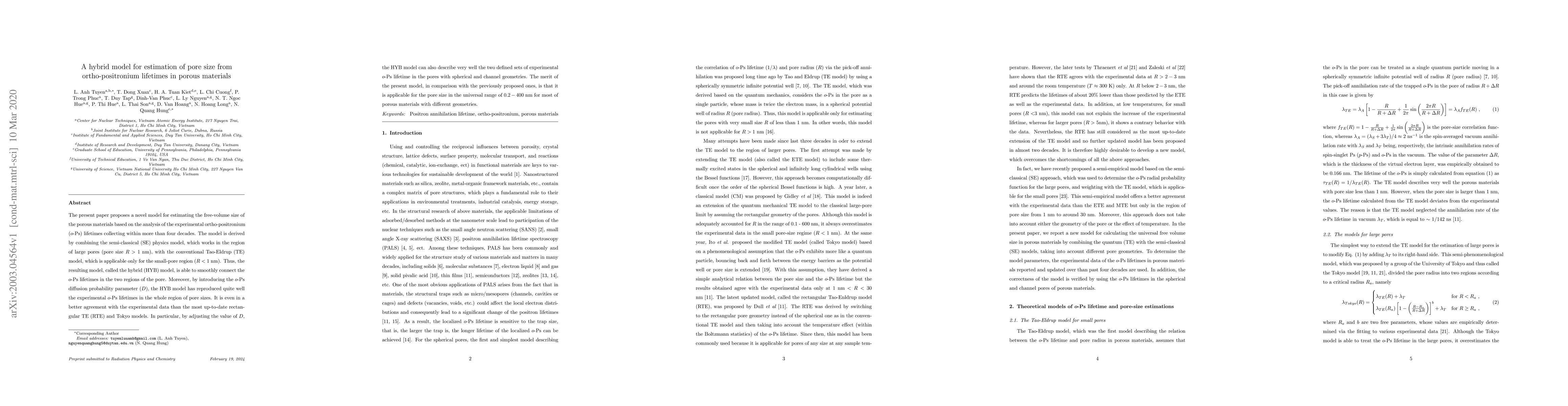The present paper proposes a novel model for estimating the free-volume size of porous materials based on the analysis of various experimental ortho-positronium ($o$-Ps) lifetime data. The model is derived by combining the semi-classical (SE) physics model, which works in the region of large pores (pore size $R >$ 1 nm), with the conventional Tao-Eldrup (TE) model, which is applicable only for the small-pore region ($R <$ 1 nm). Thus, the proposed model, called the hybrid (HYB) model, is able to smoothly connect the $o$-Ps lifetimes in the two regions of the pore. Moreover, by introducing the $o$-Ps diffusion probability parameter ($D$), the HYB model has reproduced quite well the experimental $o$-Ps lifetimes in the whole region of pore sizes. It is even in a better agreement with the experimental data than the most up-to-date rectangular TE (RTE) and Tokyo models. In particular, by adjusting the value of $D$, the HYB model can also describe very well the two defined sets of experimental $o$-Ps lifetimes in the pores with spherical and channel geometries. The merit of the present model, in comparison with the previously proposed ones, is that it is applicable for the pore size in the universal range of $0.2 - 400$ nm for most of porous materials with different geometries.