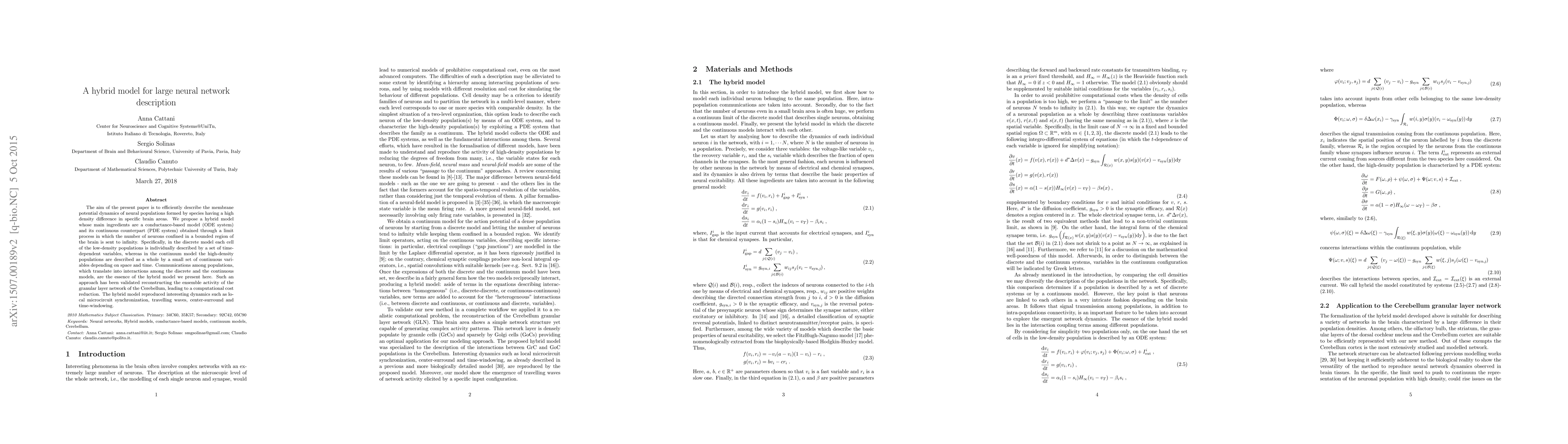 The aim of the present paper is to efficiently describe the membrane potential dynamics of neural populations formed by species having a high density difference in specific brain areas. We propose a hybrid model whose main ingredients are a conductance-based model (ODE system) and its continuous counterpart (PDE system) obtained through a limit process in which the number of neurons confined in a bounded region of the brain is sent to infinity. Specifically, in the discrete model each cell of the low-density populations is individually described by a set of time-dependent variables, whereas in the continuum model the high-density populations are described as a whole by a small set of continuous variables depending on space and time. Communications among populations, which translate into interactions among the discrete and the continuous models, are the essence of the hybrid model we present here. Such an approach has been validated reconstructing the ensemble activity of the granular layer network of the Cerebellum, leading to a computational cost reduction. The hybrid model reproduced interesting dynamics such as local microcircuit synchronization, travelling waves, center-surround and time-windowing.