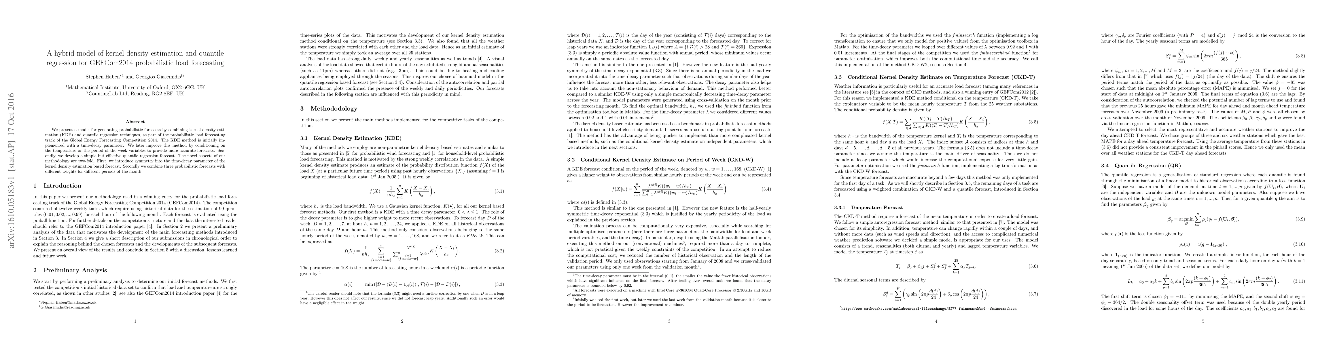 This paper proposes a hybrid model combining kernel density estimation and quantile regression for probabilistic load forecasting in the GEFCom2014 competition. The model improves accuracy by conditioning on temperature and time-of-week variables and integrates symmetry into the KDE time-decay parameter, while also weighting different probabilistic forecasts for various periods.