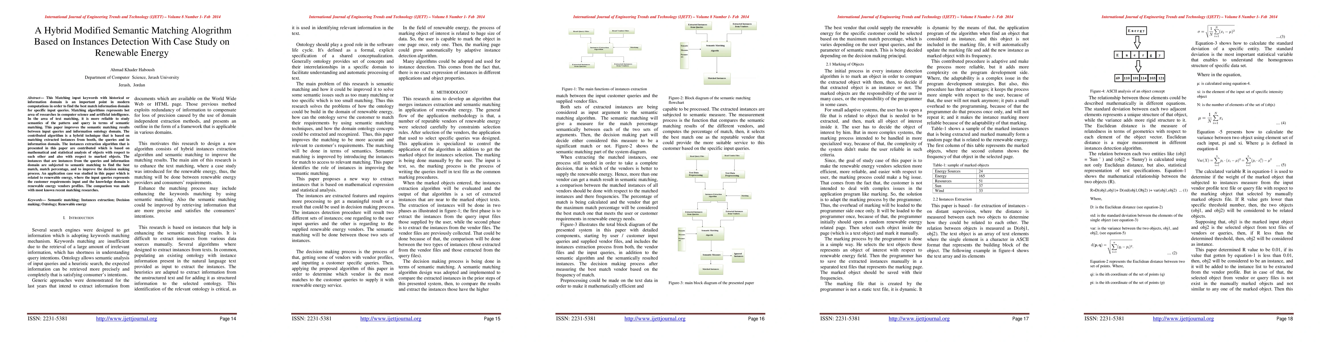 This Matching input keywords with historical or information domain is an important point in modern computations in order to find the best match information domain for specific input queries. Matching algorithms represents hot area of researches in computer science and artificial intelligence. In the area of text matching, it is more reliable to study semantics of the pattern and query in terms of semantic matching. This paper improves the semantic matching results between input queries and information ontology domain. The contributed algorithm is a hybrid technique that is based on matching extracted instances from booth, the queries and in information domain. The instances extraction algorithm that is presented in this paper are contributed which is based on mathematical and statistical analysis of objects with respect to each other and also with respect to marked objects. The instances that are instances from the queries and information domain are subjected to semantic matching to find the best match, match percentage, and to improve the decision making process. An application case was studied in this paper which is related to renewable energy, where the input queries represents the customer requirements input and the knowledge domain is renewable energy vendors profiles. The comparison was made with most known recent matching researches.