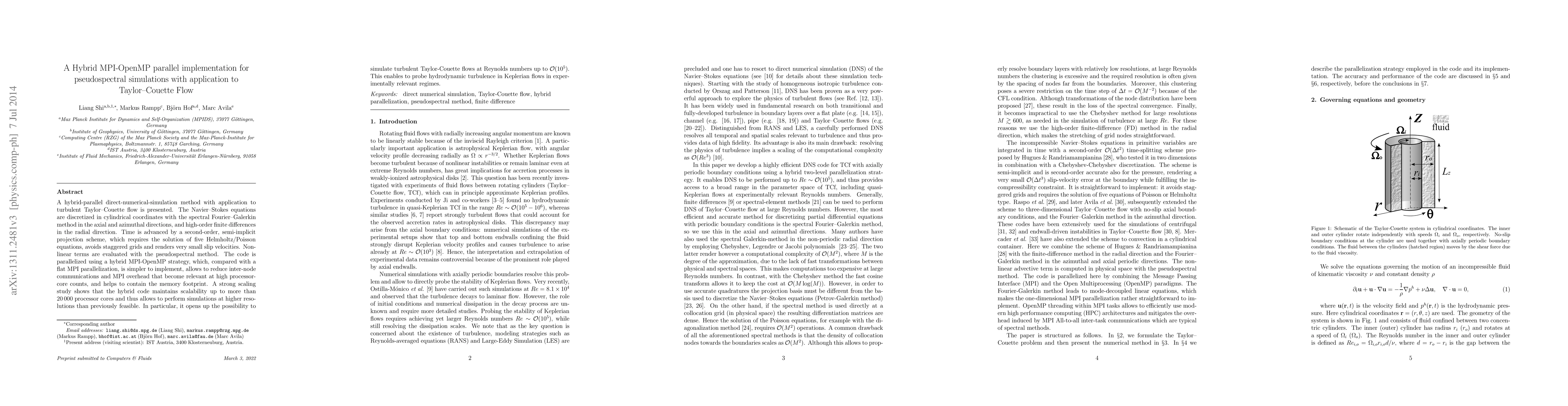 The research presents a hybrid MPI-OpenMP parallel implementation for pseudospectral simulations, specifically applied to Taylor-Couette flow. The Navier-Stokes equations are discretized using the spectral Fourier-Galerkin method in axial and azimuthal directions, and high-order finite differences in the radial direction. Time advancement is done via a second-order, semi-implicit projection scheme, which simplifies programming by solving five Helmholtz/Poisson equations without staggered grids.