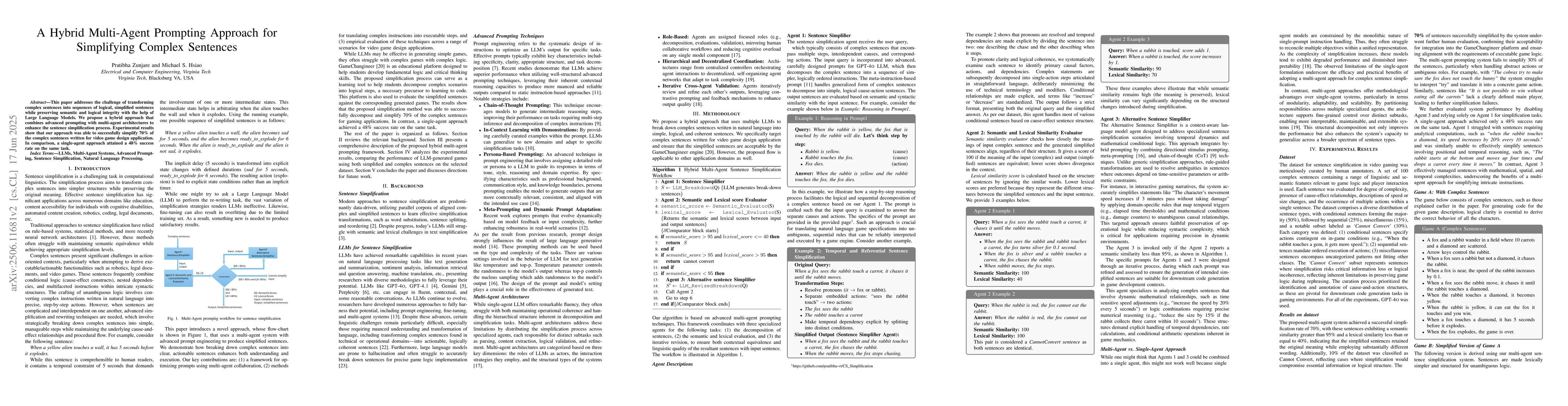 This paper addresses the challenge of transforming complex sentences into sequences of logical, simplified sentences while preserving semantic and logical integrity with the help of Large Language Models. We propose a hybrid approach that combines advanced prompting with multi-agent architectures to enhance the sentence simplification process. Experimental results show that our approach was able to successfully simplify 70% of the complex sentences written for video game design application. In comparison, a single-agent approach attained a 48% success rate on the same task.