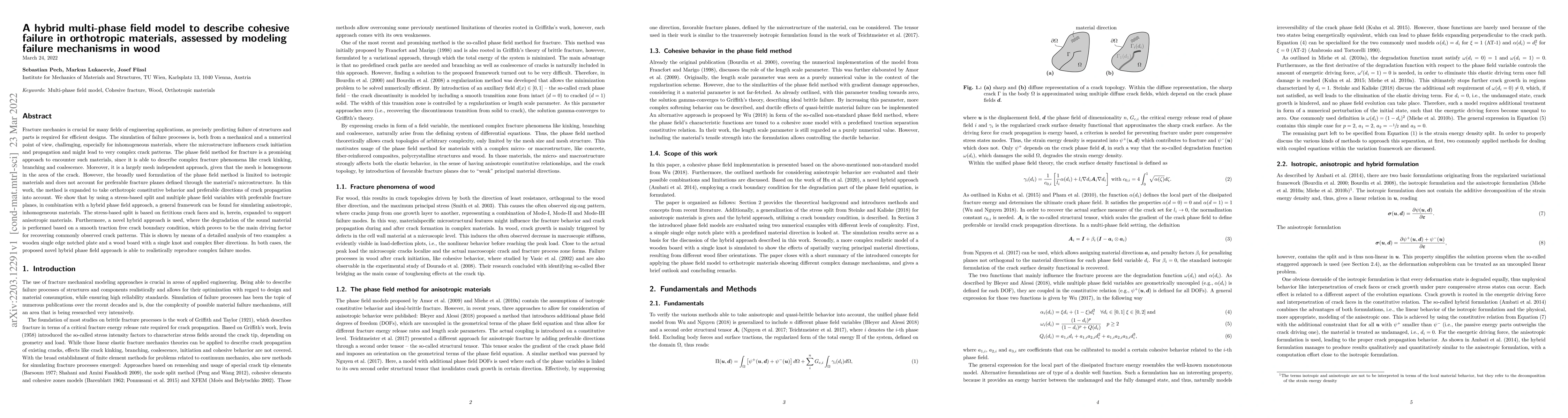 This paper proposes a hybrid multi-phase field model to simulate cohesive failure in orthotropic materials, specifically wood, by incorporating anisotropic fracture behavior and preferred fracture planes. The model successfully reproduces complex failure modes, demonstrated through simulations of a notched wooden plate and a wood board with a knot and complex fibers.