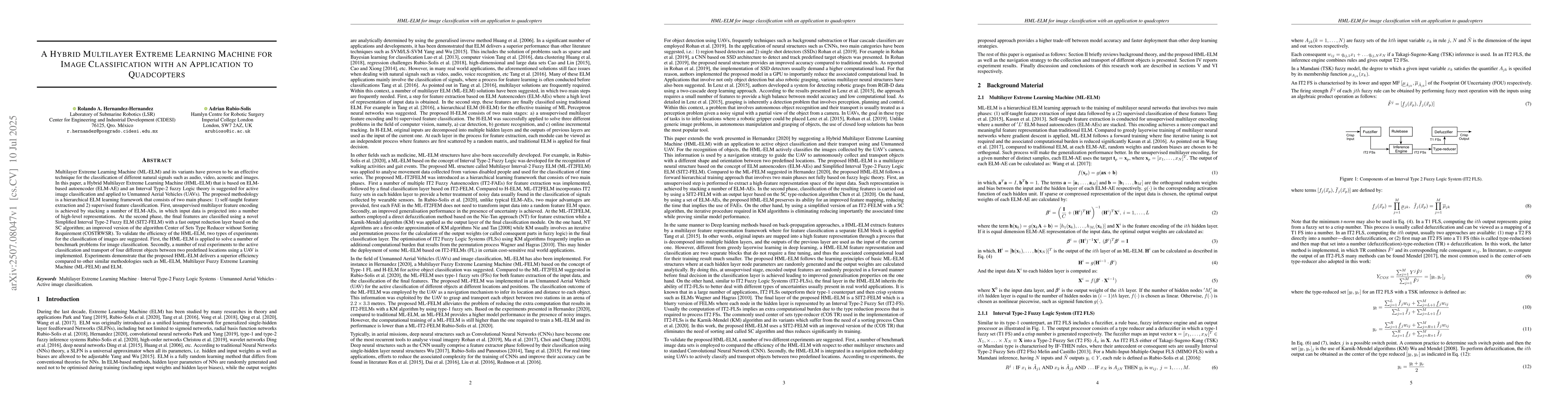 Multilayer Extreme Learning Machine (ML-ELM) and its variants have proven to be an effective technique for the classification of different natural signals such as audio, video, acoustic and images. In this paper, a Hybrid Multilayer Extreme Learning Machine (HML-ELM) that is based on ELM-based autoencoder (ELM-AE) and an Interval Type-2 fuzzy Logic theory is suggested for active image classification and applied to Unmanned Aerial Vehicles (UAVs). The proposed methodology is a hierarchical ELM learning framework that consists of two main phases: 1) self-taught feature extraction and 2) supervised feature classification. First, unsupervised multilayer feature encoding is achieved by stacking a number of ELM-AEs, in which input data is projected into a number of high-level representations. At the second phase, the final features are classified using a novel Simplified Interval Type-2 Fuzzy ELM (SIT2-FELM) with a fast output reduction layer based on the SC algorithm; an improved version of the algorithm Center of Sets Type Reducer without Sorting Requirement (COSTRWSR). To validate the efficiency of the HML-ELM, two types of experiments for the classification of images are suggested. First, the HML-ELM is applied to solve a number of benchmark problems for image classification. Secondly, a number of real experiments to the active classification and transport of four different objects between two predefined locations using a UAV is implemented. Experiments demonstrate that the proposed HML-ELM delivers a superior efficiency compared to other similar methodologies such as ML-ELM, Multilayer Fuzzy Extreme Learning Machine (ML-FELM) and ELM.
