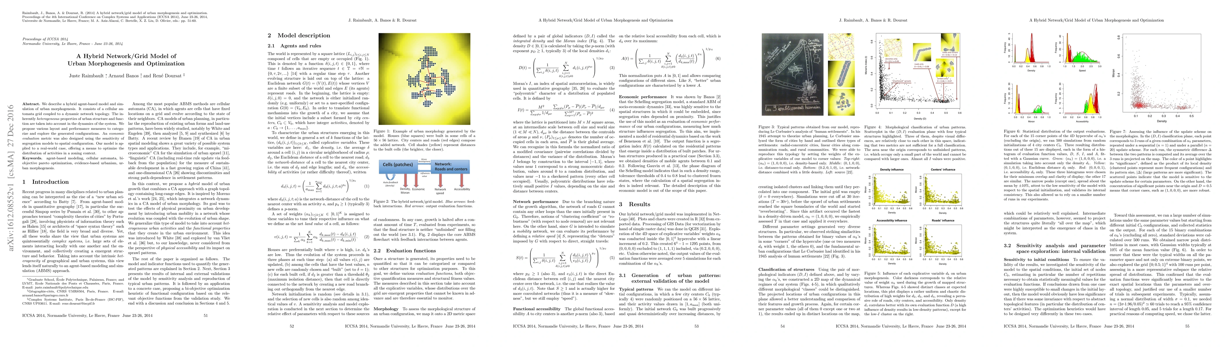 We describe a hybrid agent-based model and simulation of urban morphogenesis. It consists of a cellular automata grid coupled to a dynamic network topology. The inherently heterogeneous properties of urban structure and function are taken into account in the dynamics of the system. We propose various layout and performance measures to categorize and explore the generated configurations. An economic evaluation metric was also designed using the sensitivity of segregation models to spatial configuration. Our model is applied to a real-world case, offering a means to optimize the distribution of activities in a zoning context.