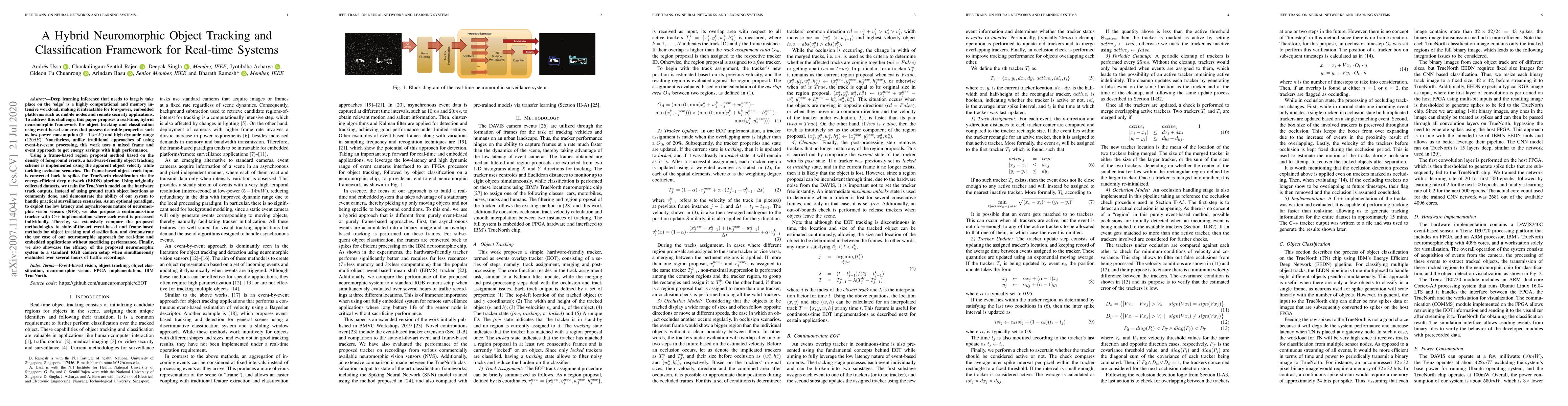 Deep learning inference that needs to largely take place on the 'edge' is a highly computational and memory intensive workload, making it intractable for low-power, embedded platforms such as mobile nodes and remote security applications. To address this challenge, this paper proposes a real-time, hybrid neuromorphic framework for object tracking and classification using event-based cameras that possess properties such as low-power consumption (5-14 mW) and high dynamic range (120 dB). Nonetheless, unlike traditional approaches of using event-by-event processing, this work uses a mixed frame and event approach to get energy savings with high performance. Using a frame-based region proposal method based on the density of foreground events, a hardware-friendly object tracking scheme is implemented using the apparent object velocity while tackling occlusion scenarios. The object track input is converted back to spikes for TrueNorth classification via the energy-efficient deep network (EEDN) pipeline. Using originally collected datasets, we train the TrueNorth model on the hardware track outputs, instead of using ground truth object locations as commonly done, and demonstrate the ability of our system to handle practical surveillance scenarios. As an optional paradigm, to exploit the low latency and asynchronous nature of neuromorphic vision sensors (NVS), we also propose a continuous-time tracker with C++ implementation where each event is processed individually. Thereby, we extensively compare the proposed methodologies to state-of-the-art event-based and frame-based methods for object tracking and classification, and demonstrate the use case of our neuromorphic approach for real-time and embedded applications without sacrificing performance. Finally, we also showcase the efficacy of the proposed system to a standard RGB camera setup when evaluated over several hours of traffic recordings.