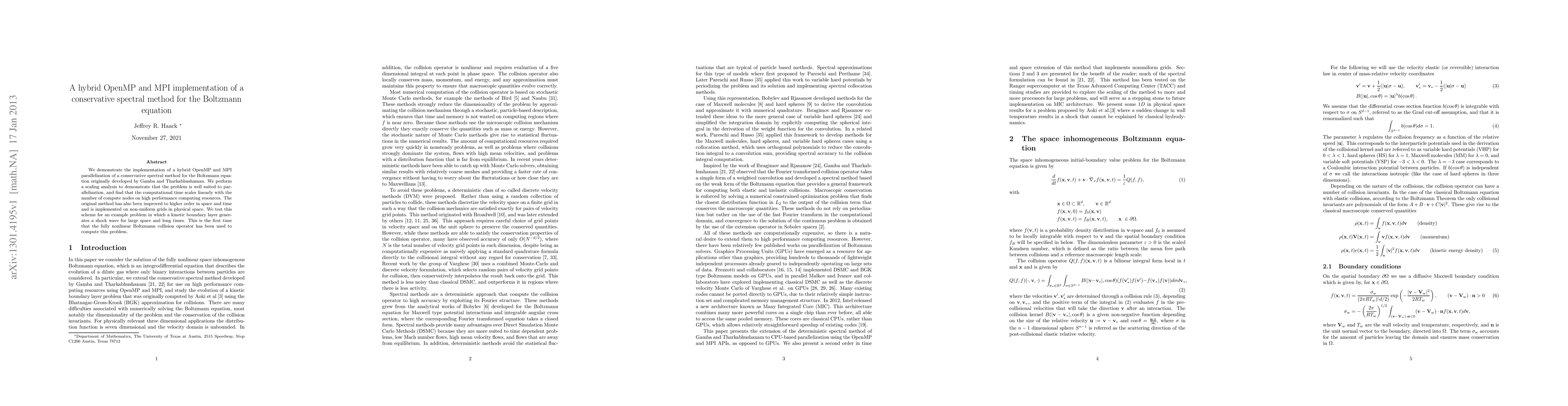 This paper presents a hybrid OpenMP and MPI parallelization of a conservative spectral method for solving the Boltzmann equation, demonstrating linear scaling with compute nodes and improved computational efficiency. The method is tested on a kinetic boundary layer problem generating a shock wave, marking the first use of the fully nonlinear Boltzmann collision operator for such simulations.