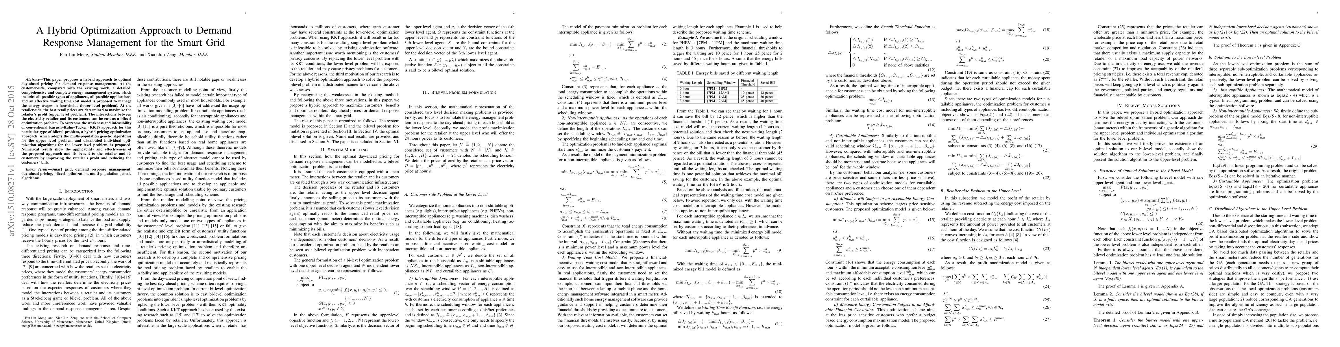 This paper proposes a hybrid optimization approach for day-ahead pricing in demand response management for the smart grid, using multi-population genetic algorithms for retailer profit maximization and distributed individual optimization for customer energy management. The approach effectively balances retailer profits and customer energy costs.