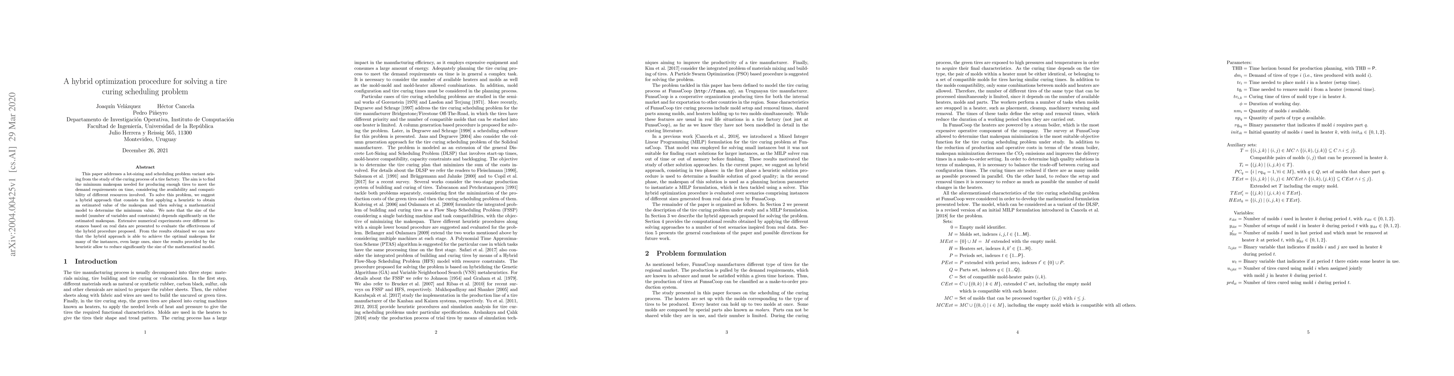 This paper proposes a hybrid optimization procedure for solving a tire curing scheduling problem, combining a heuristic to estimate the makespan and a mathematical model to find the optimal solution. The hybrid approach effectively reduces the model size and achieves optimal makespan for various instances based on real data.