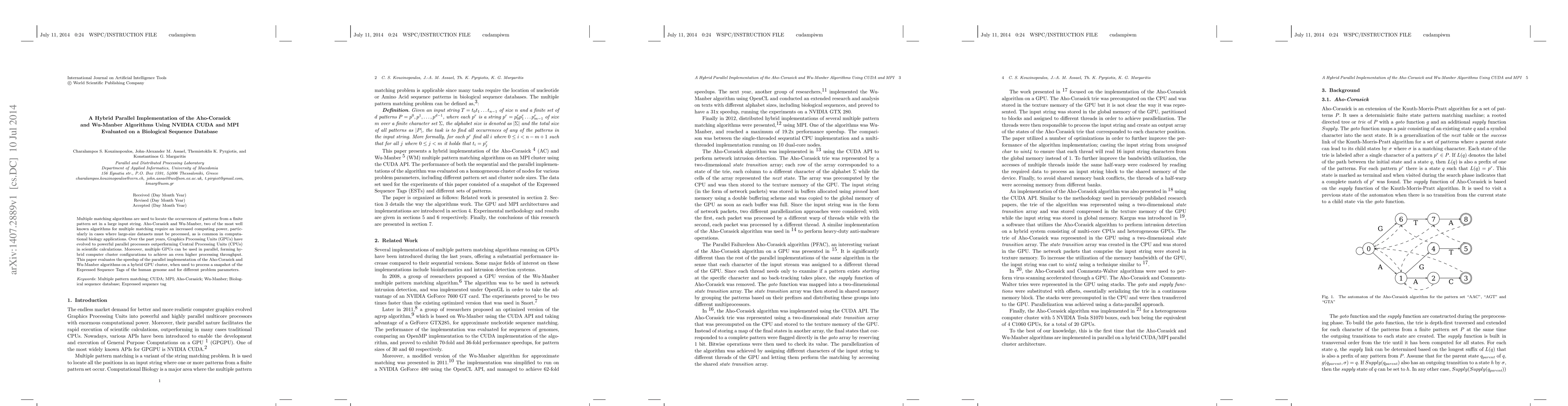 This paper presents a hybrid parallel implementation of the Aho-Corasick and Wu-Manber algorithms using CUDA and MPI on a GPU cluster to enhance computational efficiency for large-scale biological sequence data analysis. The performance evaluation demonstrates significant speedup compared to traditional CPU-based implementations.
