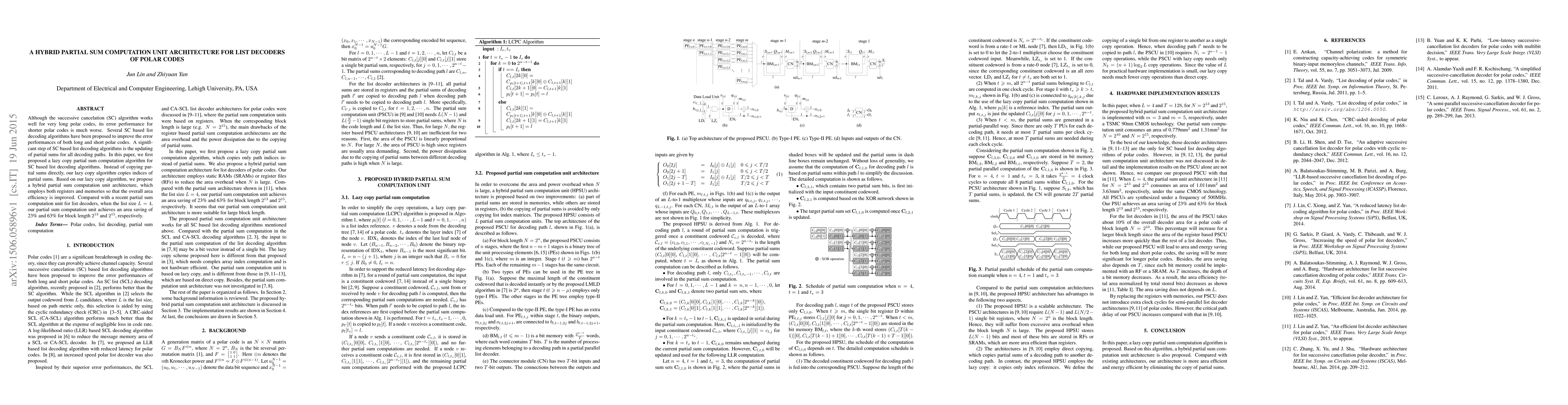 This paper proposes a hybrid architecture for computing partial sums in list decoders for polar codes, utilizing a lazy copy partial sum computation algorithm to enhance area efficiency. The new architecture achieves significant area savings of 23% and 63% for block lengths of 2^13 and 2^15, respectively, compared to existing methods.