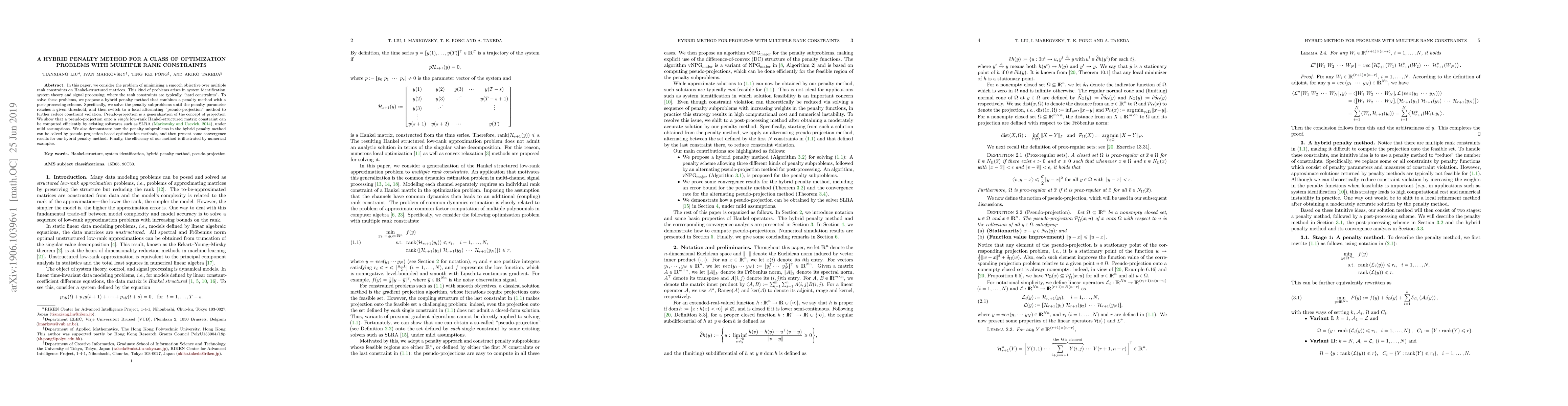 This paper proposes a hybrid penalty method to solve optimization problems with multiple rank constraints on Hankel-structured matrices, combining a penalty approach with a post-processing scheme to efficiently minimize the objective function. The method is demonstrated to be effective through numerical examples and convergence analysis.