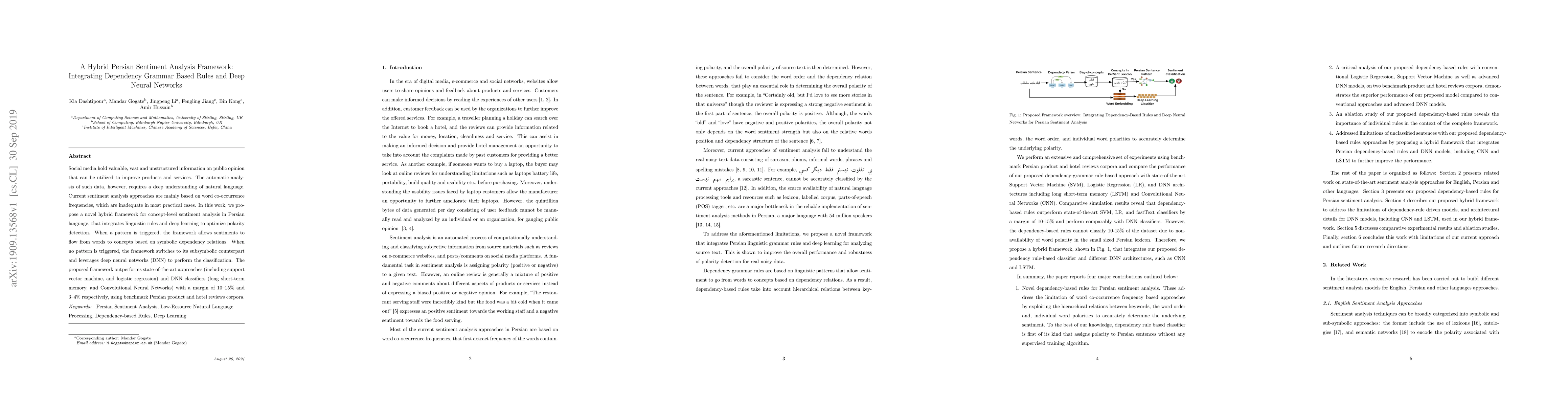 This paper proposes a hybrid Persian sentiment analysis framework that combines dependency grammar rules with deep neural networks for improved polarity detection. The framework outperforms existing methods and deep learning classifiers by leveraging both linguistic rules and DNNs for concept-level sentiment analysis.