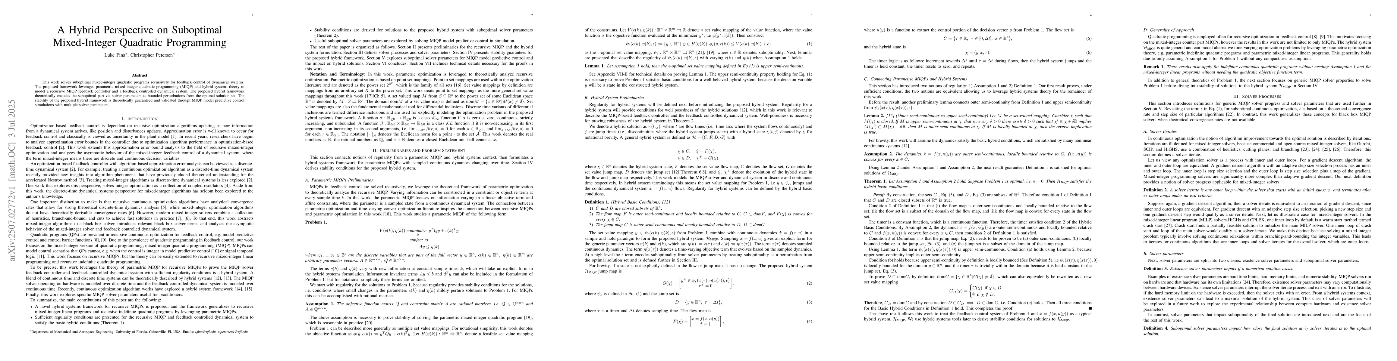 This work solves suboptimal mixed-integer quadratic programs recursively for feedback control of dynamical systems. The proposed framework leverages parametric mixed-integer quadratic programming (MIQP) and hybrid systems theory to model a recursive MIQP feedback controller and a feedback controlled dynamical system. The proposed hybrid framework theoretically encodes the suboptimal part via solver parameters as bounded perturbations from the optimal solution set. The stability of the proposed hybrid framework is theoretically guaranteed and validated through MIQP model predictive control simulations with multiple solver parameters.