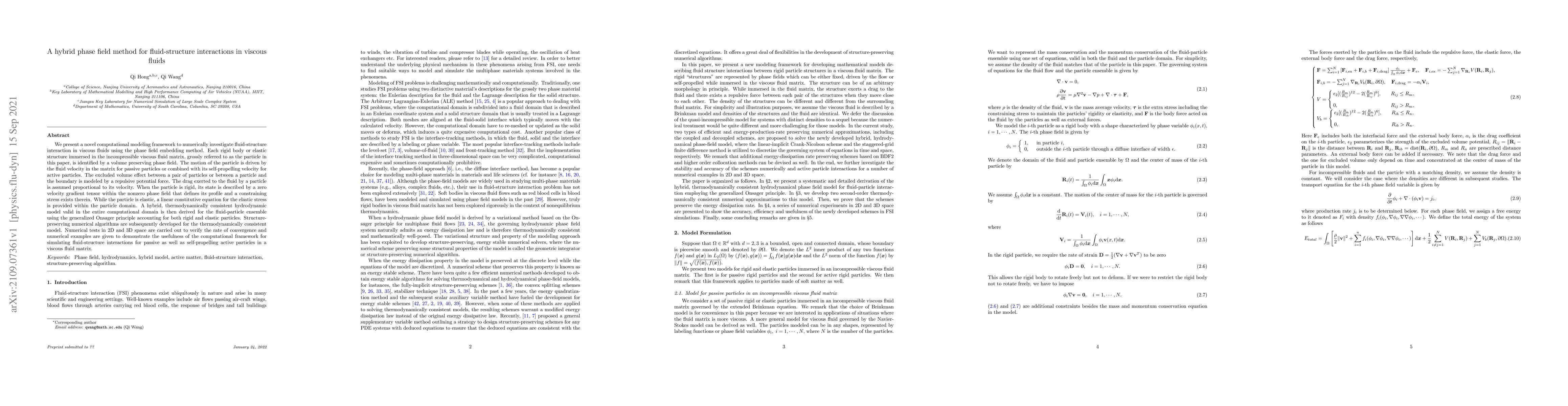 This paper introduces a hybrid phase field method for fluid-structure interactions in viscous fluids, employing a volume-preserving phase field to model particles and deriving a thermodynamically consistent hydrodynamic model. Numerical algorithms and tests validate the framework's effectiveness for simulating both passive and active particles.