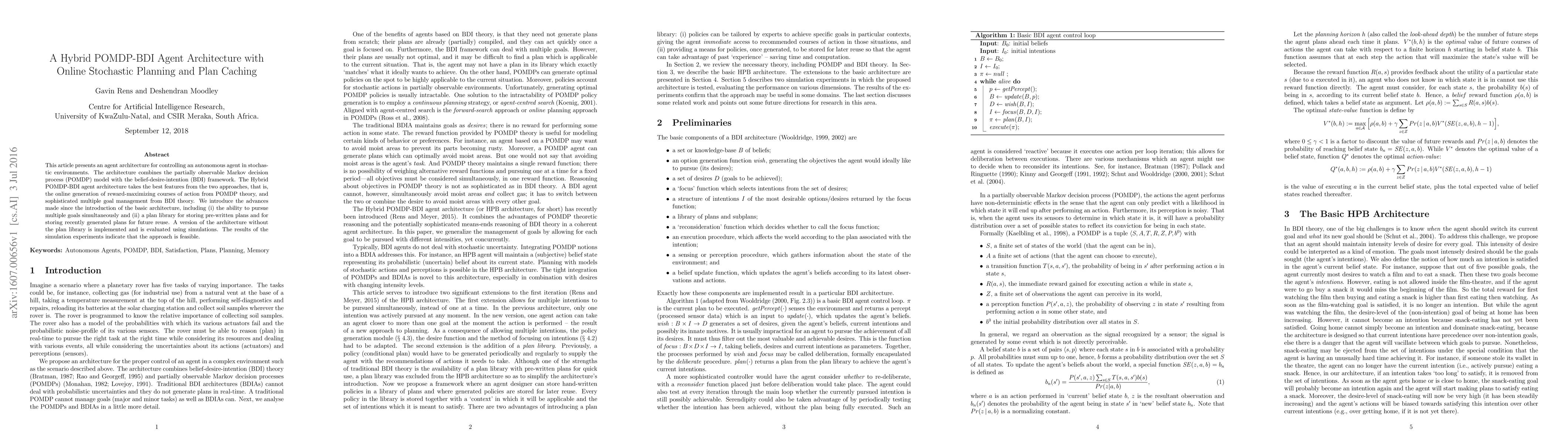 This paper introduces a hybrid POMDP-BDI agent architecture that combines the strengths of both models for autonomous agent control in stochastic environments, featuring online stochastic planning and a plan cache for efficient goal management and reuse. Simulation results show the feasibility of the proposed approach.