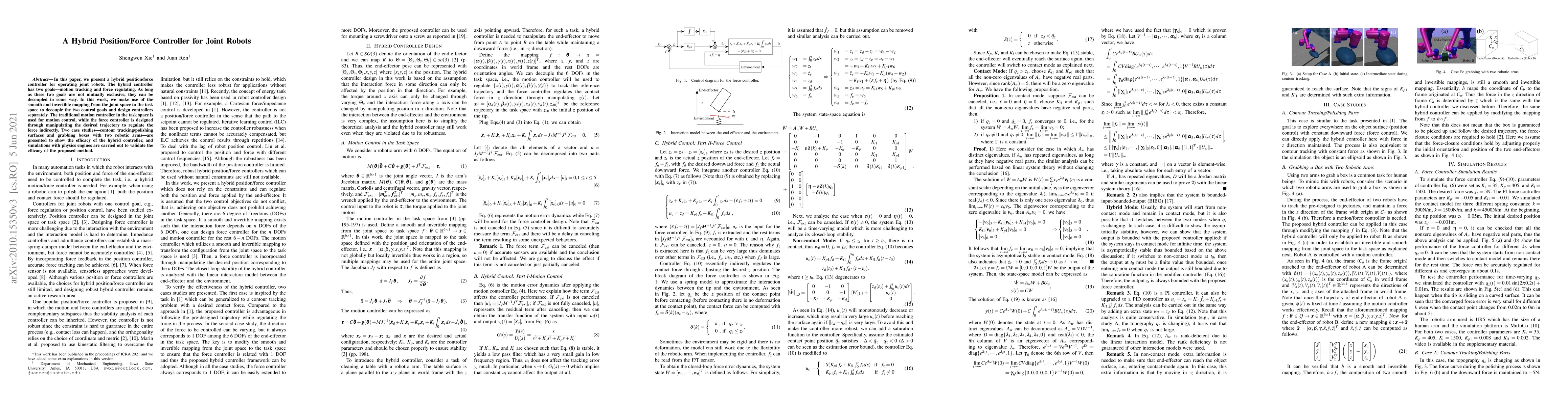The research presents a hybrid position/force controller for joint robots, utilizing a smooth and invertible mapping from joint space to task space to decouple motion and force control goals, with separate controller designs for each.