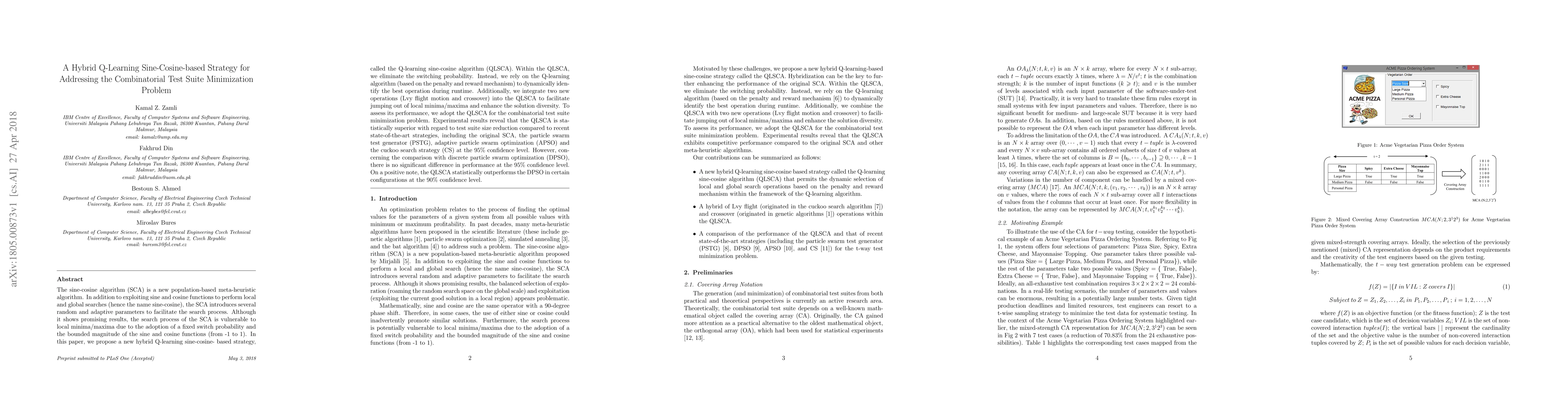 This paper proposes a hybrid Q-learning sine-cosine algorithm (QLSCA) to tackle the combinatorial test suite minimization problem, improving upon the original sine-cosine algorithm by dynamically selecting operations through Q-learning and integrating L\'evy flight motion and crossover to enhance solution diversity. Experimental results show QLSCA significantly reduces test suite size better than several state-of-the-art methods.