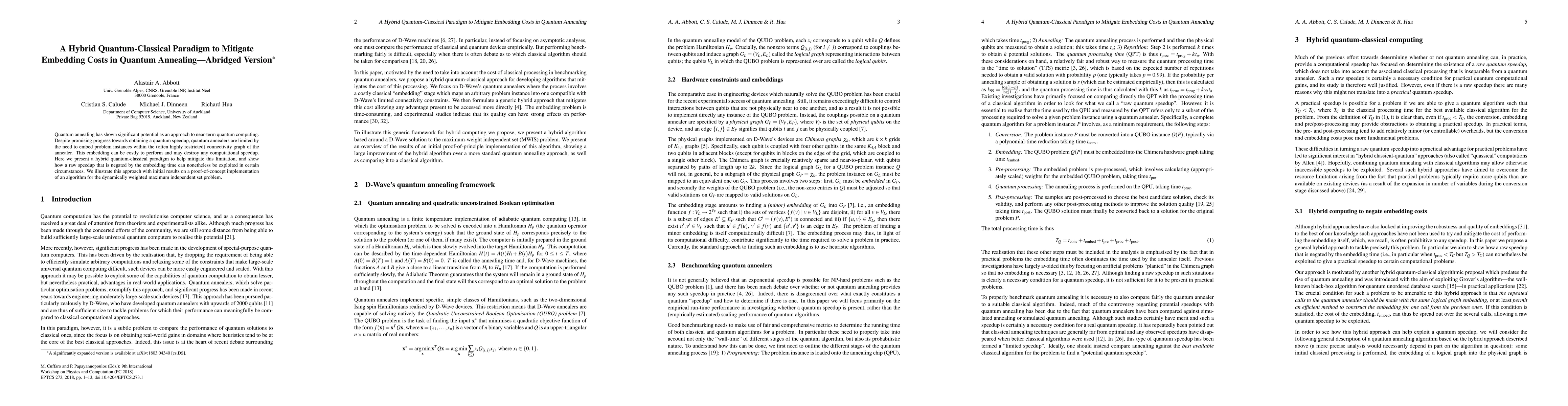 This paper proposes a hybrid quantum-classical approach to reduce embedding costs in quantum annealing, demonstrating that despite the time-consuming embedding process, a quantum speedup can still be achieved in certain scenarios. Initial results from a proof-of-concept algorithm for the dynamically weighted maximum independent set problem are presented.