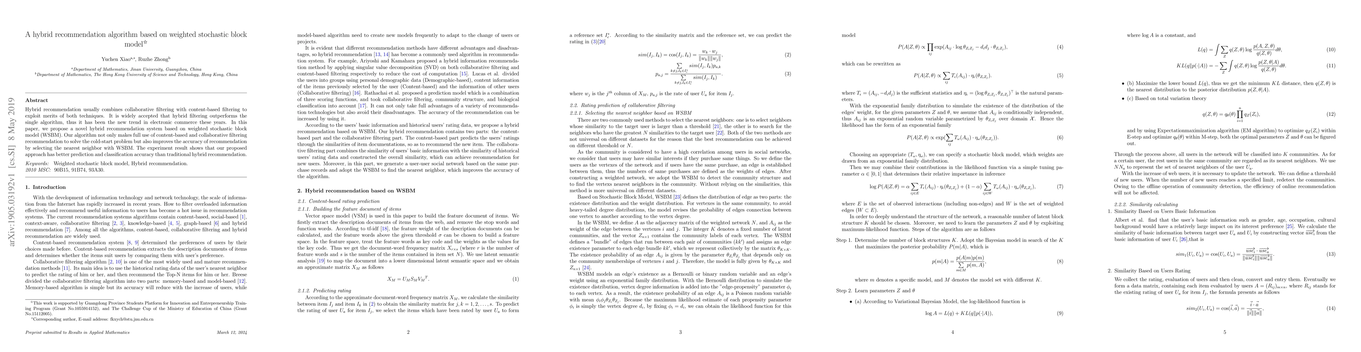 Hybrid recommendation usually combines collaborative filtering with content-based filtering to exploit merits of both techniques. It is widely accepted that hybrid filtering outperforms the single algorithm, thus it has been the new trend in electronic commerce these years. In this paper, we propose a novel hybrid recommendation system based on weighted stochastic block model (WSBM). Our algorithm not only makes full use of content-based and collaborative filtering recommendation to solve the cold-start problem but also improves the accuracy of recommendation by selecting the nearest neighbor with WSBM. The experiment result shows that our proposed approach has better prediction and classification accuracy than traditional hybrid recommendation.