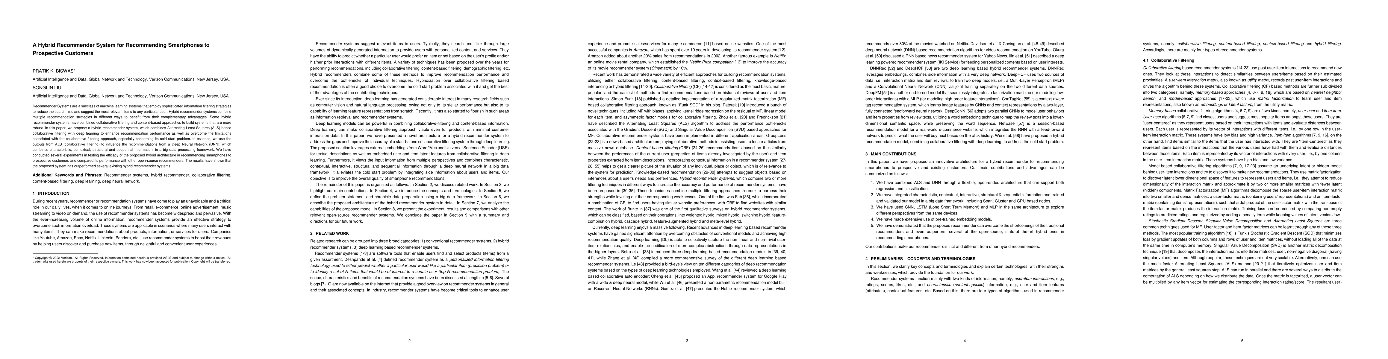 This paper proposes a hybrid recommender system combining ALS-based collaborative filtering with deep learning to recommend smartphones. Experiments show the system outperforms existing hybrid recommenders, addressing limitations like the cold start problem.