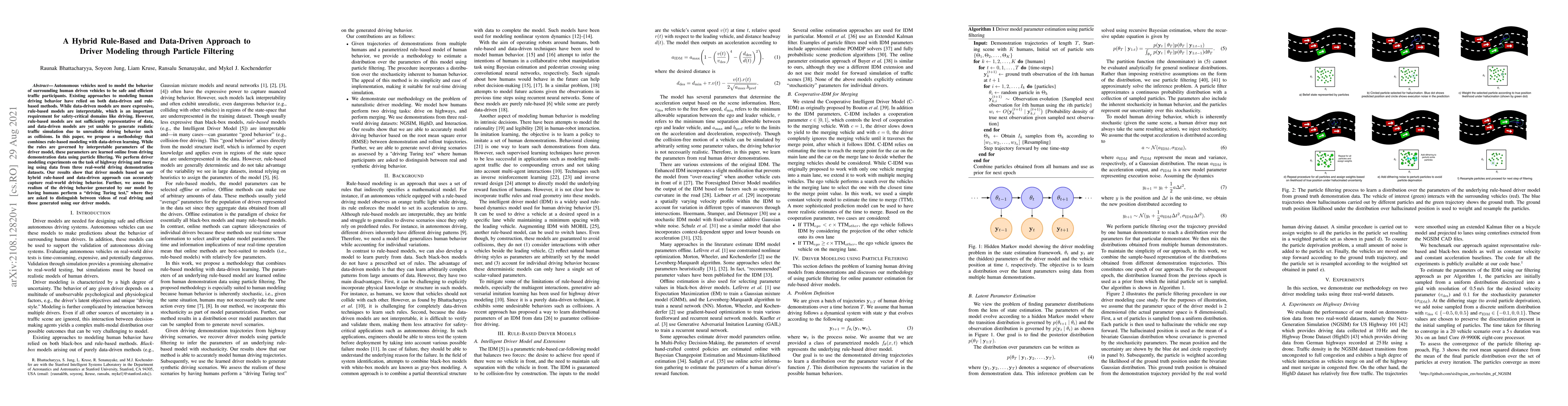 This paper proposes a hybrid approach combining rule-based and data-driven models for driver behavior modeling in autonomous vehicles, using particle filtering to learn interpretable parameters from real-world driving data. Experiments show the approach accurately captures real driving behavior and generates realistic traffic simulations.