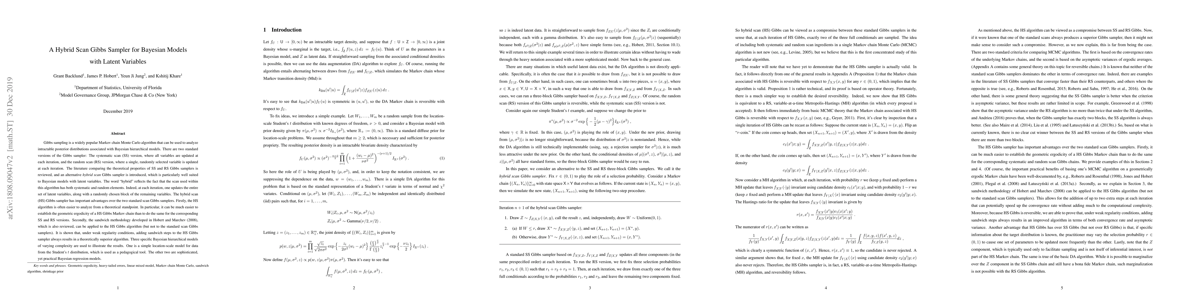 The paper introduces a hybrid scan Gibbs sampler that combines systematic and random scan elements, offering advantages in theoretical analysis and performance for Bayesian models with latent variables. The hybrid approach facilitates easier establishment of geometric ergodicity and can incorporate sandwich methodology for improved efficiency.