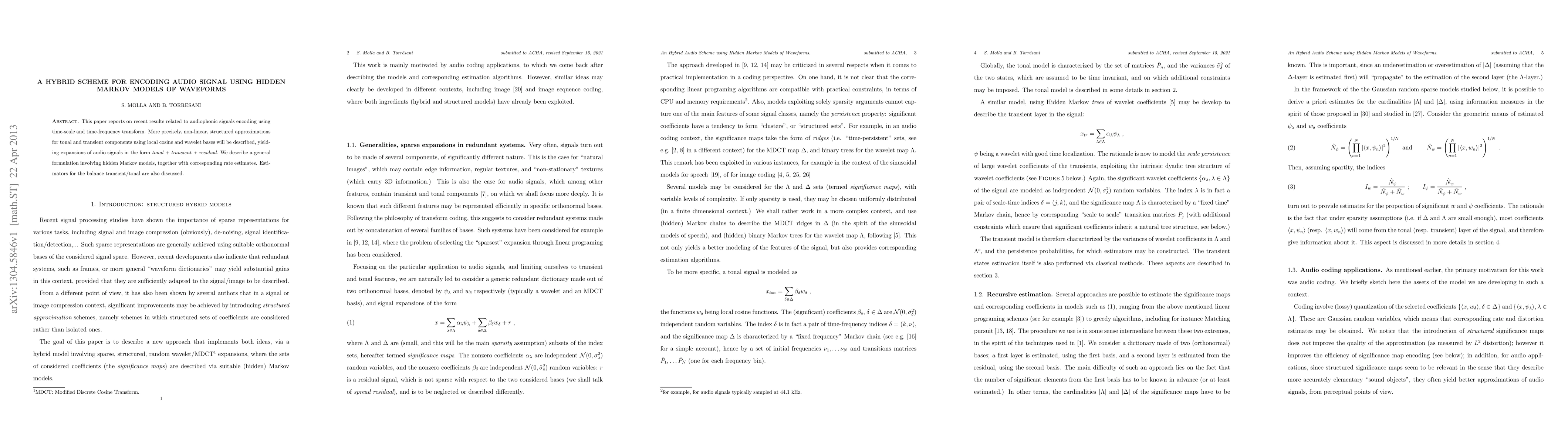This paper reports on recent results related to audiophonic signals encoding using time-scale and time-frequency transform. More precisely, non-linear, structured approximations for tonal and transient components using local cosine and wavelet bases will be described, yielding expansions of audio signals in the form tonal + transient + residual. We describe a general formulation involving hidden Markov models, together with corresponding rate estimates. Estimators for the balance transient/tonal are also discussed.