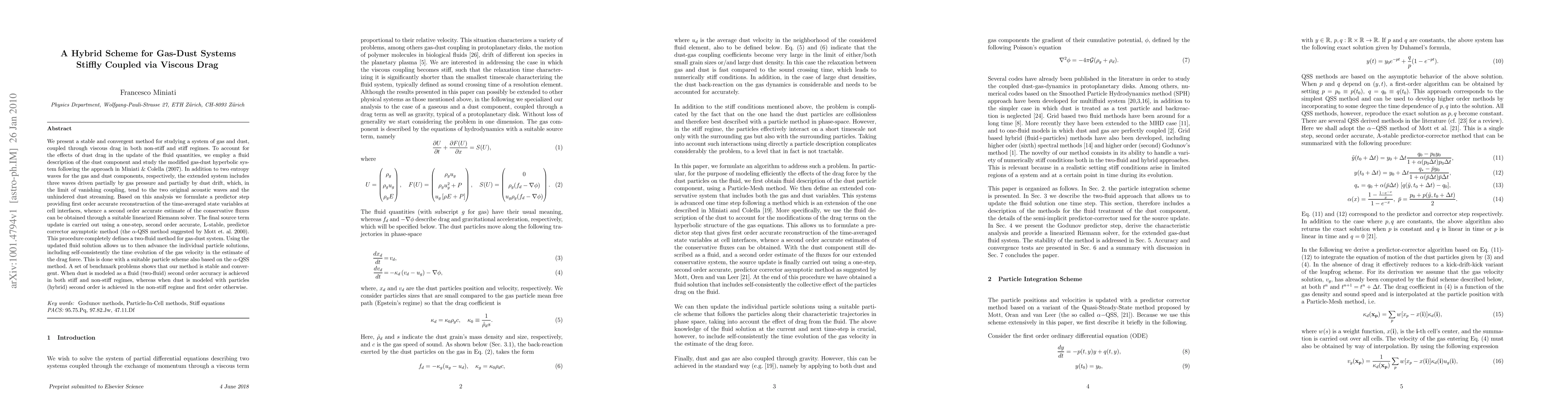 We present a stable and convergent method for studying a system of gas and dust, coupled through viscous drag in both non-stiff and stiff regimes. To account for the effects of dust drag in the update of the fluid quantities, we employ a fluid description of the dust component and study the modified gas-dust hyperbolic system following the approach in Miniati & Colella (2007). In addition to two entropy waves for the gas and dust components, respectively, the extended system includes three waves driven partially by gas pressure and partially by dust drift, which, in the limit of vanishing coupling, tend to the two original acoustic waves and the unhindered dust streaming. Based on this analysis we formulate a predictor step providing first order accurate reconstruction of the time-averaged state variables at cell interfaces, whence a second order accurate estimate of the conservative fluxes can be obtained through a suitable linearized Riemann solver. The final source term update is carried out using a one-step, second order accurate, L-stable, predictor corrector asymptotic method (the alpha-QSS method suggested by Mott et. al. 2000). This procedure completely defines a two-fluid method for gas-dust system. Using the updated fluid solution allows us to then advance the individual particle solutions, including self-consistently the time evolution of the gas velocity in the estimate of the drag force. This is done with a suitable particle scheme also based on the alpha-QSS method. A set of benchmark problems shows that our method is stable and convergent. When dust is modeled as a fluid (two-fluid) second order accuracy is achieved in both stiff and non-stiff regimes, whereas when dust is modeled with particles (hybrid) second order is achieved in the non-stiff regime and first order otherwise.