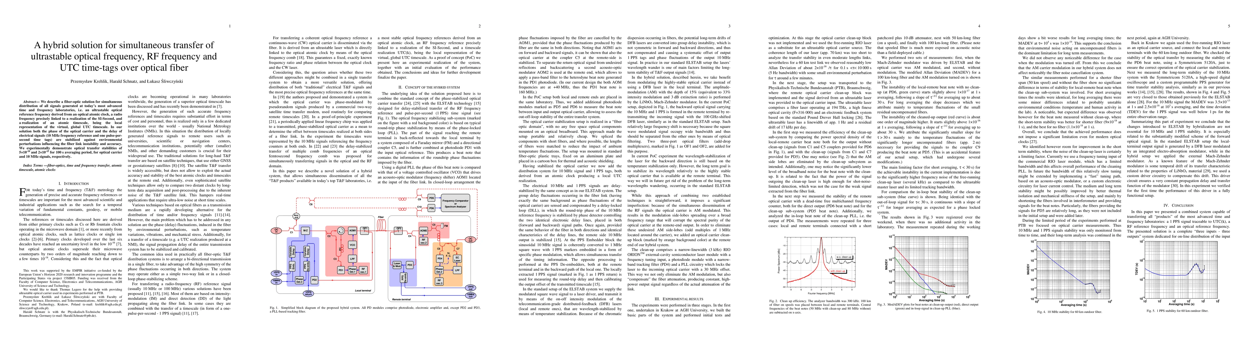 This paper presents a hybrid fiber-optic solution for the simultaneous transfer of ultrastable optical frequency, RF frequency, and UTC time-tags, stabilizing both optical and electrical signals against environmental perturbations. Experimental results show optical transfer stabilities of 5e-18 and 2e-15 for 100 s averaging for optical carrier and 10 MHz signals, respectively.