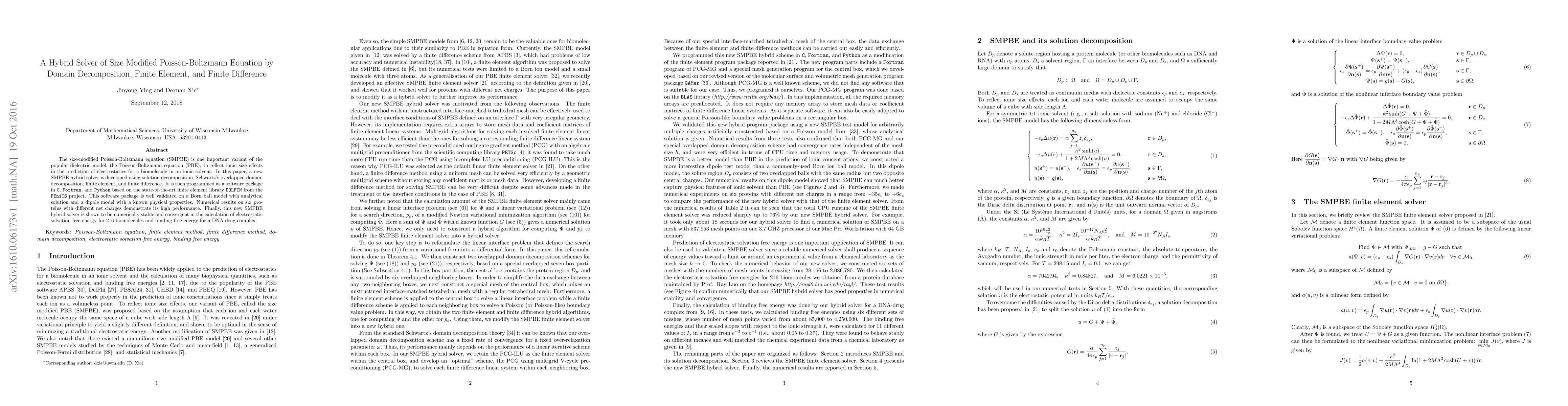 This paper presents a hybrid solver for the size-modified Poisson-Boltzmann equation (SMPBE) using domain decomposition, finite element, and finite difference methods, validated with analytical and physical models. The software is demonstrated to be high-performing and stable for calculating electrostatic solvation and binding free energies in biomolecules.