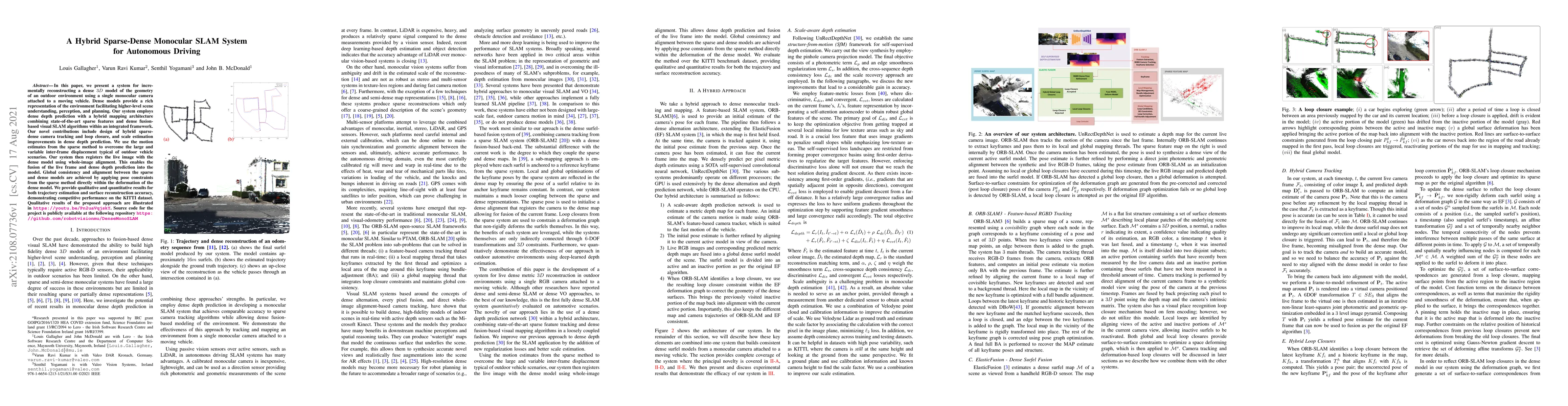 This paper introduces a hybrid sparse-dense monocular SLAM system for autonomous driving, combining sparse feature tracking and dense depth prediction to incrementally reconstruct a rich 3D model of the environment. The system achieves global consistency and alignment between sparse and dense models, demonstrating competitive performance on the KITTI dataset.