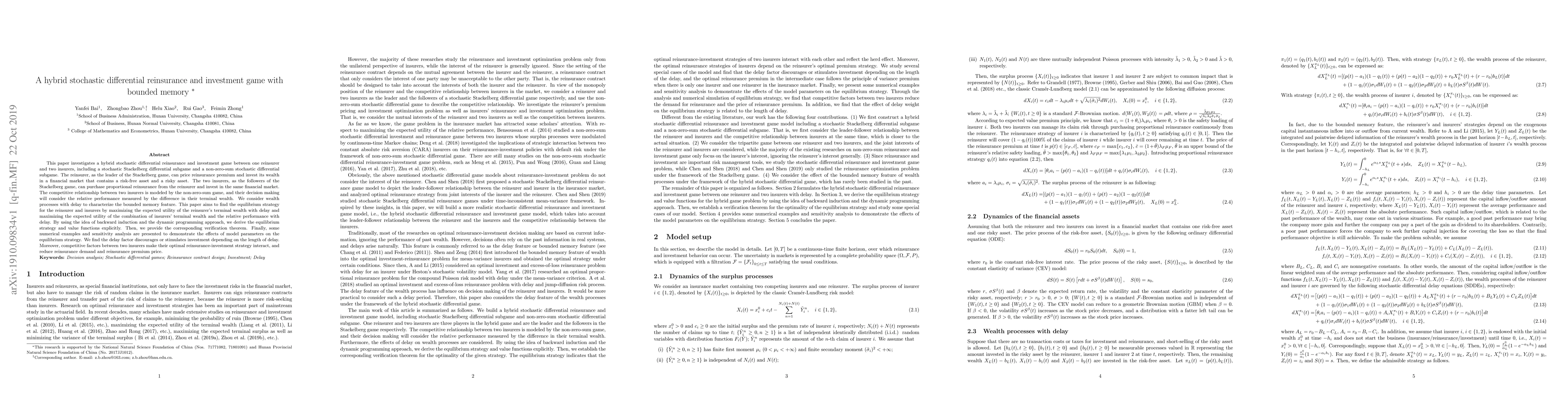 This paper studies a hybrid reinsurance and investment game between a reinsurer and two insurers, incorporating a Stackelberg differential game and a non-zero-sum game. It derives equilibrium strategies using backward induction and dynamic programming, revealing how delay and competition influence optimal reinsurance and investment decisions.