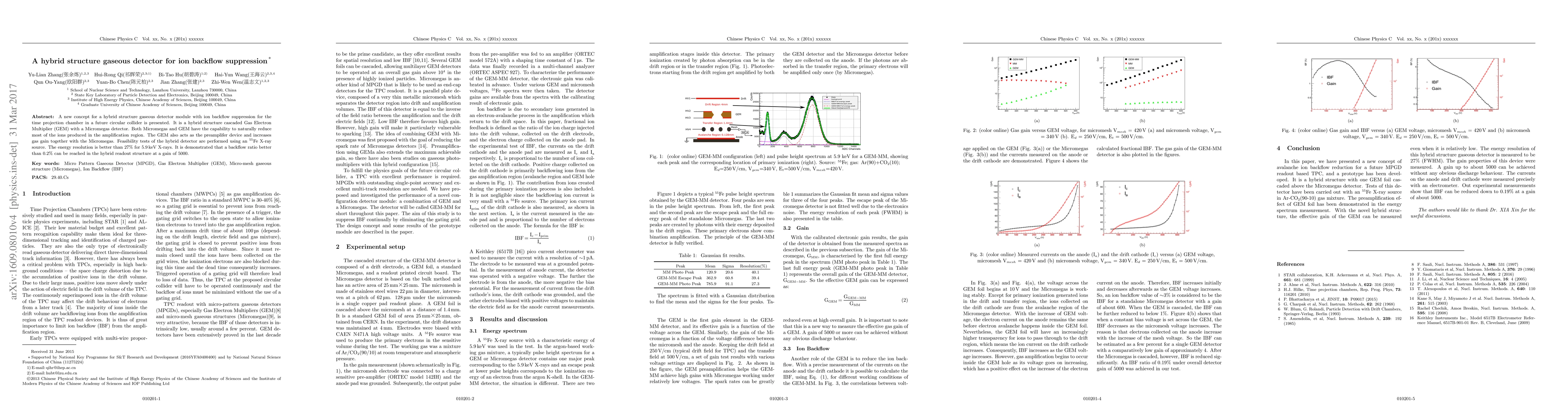 A hybrid gaseous detector combining Gas Electron Multiplier (GEM) and Micromegas technology effectively suppresses ion backflow, demonstrating excellent energy resolution and high gain for future circular collider time projection chambers. Feasibility tests with ${}^{55}$Fe X-rays show an energy resolution under 27% for 5.9 keV X-rays and a backflow ratio below 0.2% at a gain of 5000.