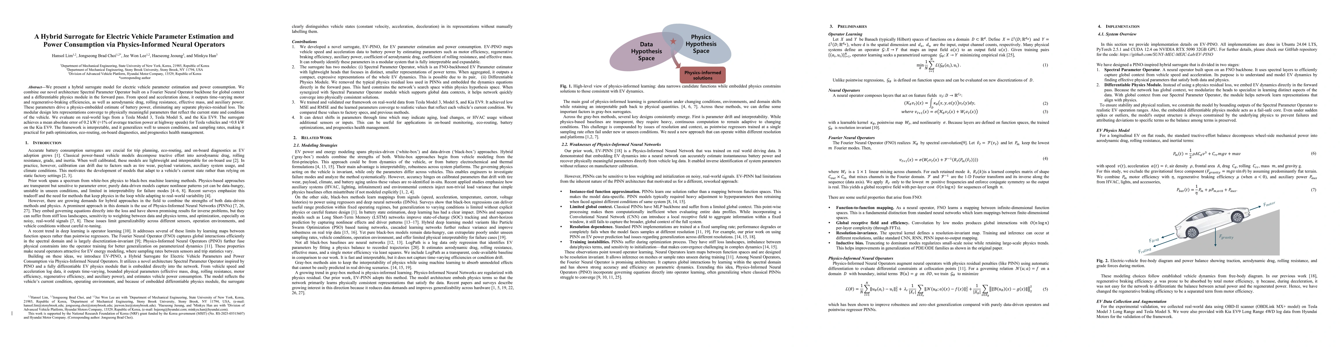 We present a hybrid surrogate model for electric vehicle parameter estimation and power consumption. We combine our novel architecture Spectral Parameter Operator built on a Fourier Neural Operator backbone for global context and a differentiable physics module in the forward pass. From speed and acceleration alone, it outputs time-varying motor and regenerative braking efficiencies, as well as aerodynamic drag, rolling resistance, effective mass, and auxiliary power. These parameters drive a physics-embedded estimate of battery power, eliminating any separate physics-residual loss. The modular design lets representations converge to physically meaningful parameters that reflect the current state and condition of the vehicle. We evaluate on real-world logs from a Tesla Model 3, Tesla Model S, and the Kia EV9. The surrogate achieves a mean absolute error of 0.2kW (about 1% of average traction power at highway speeds) for Tesla vehicles and about 0.8kW on the Kia EV9. The framework is interpretable, and it generalizes well to unseen conditions, and sampling rates, making it practical for path optimization, eco-routing, on-board diagnostics, and prognostics health management.
