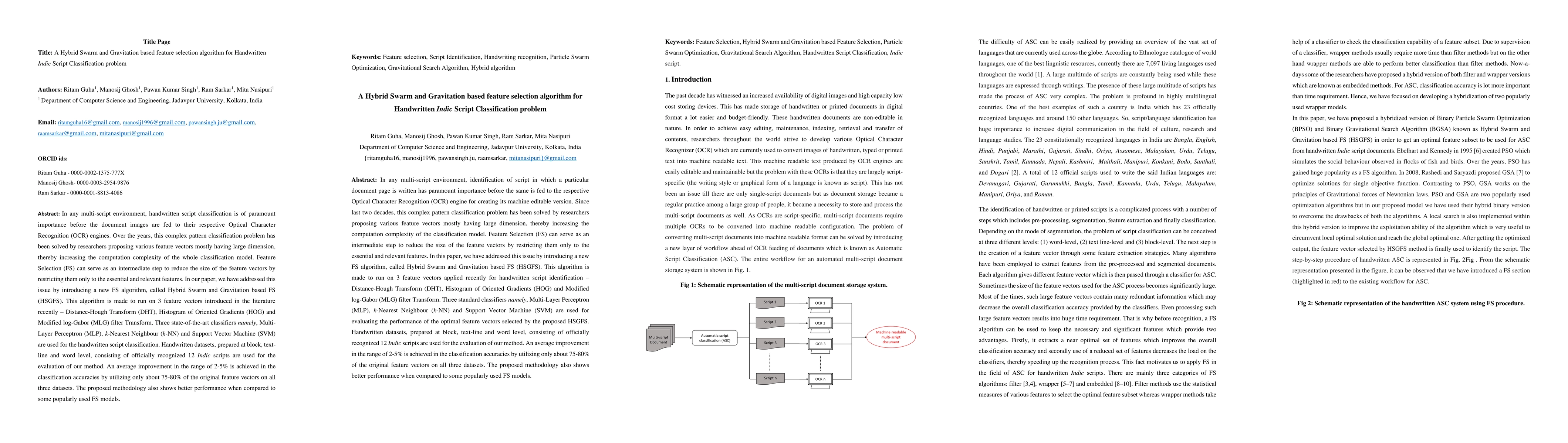 A new feature selection algorithm called Hybrid Swarm and Gravitation based FS (HSGFS) improves handwritten script classification accuracy by 2-5% by reducing feature vectors to essential features.