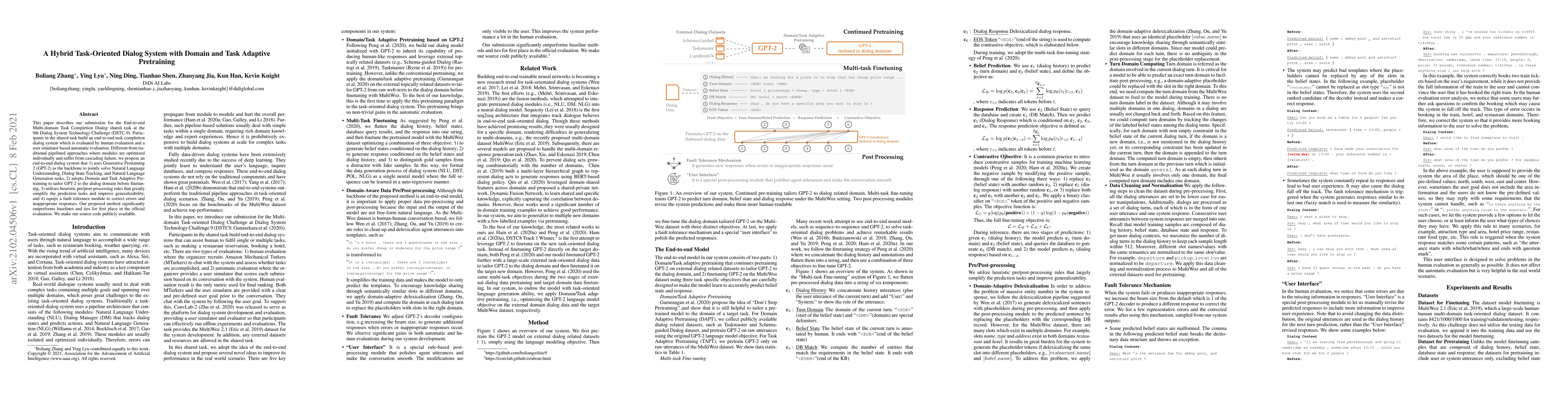 This paper proposes an end-to-end hybrid dialog system using GPT-2 with domain and task adaptive pretraining, heuristic rules, and a fault tolerance module, achieving top performance in the DSTC-9 shared task. The system outperforms traditional pipelined approaches by jointly solving NLU, dialog state tracking, and NLG.