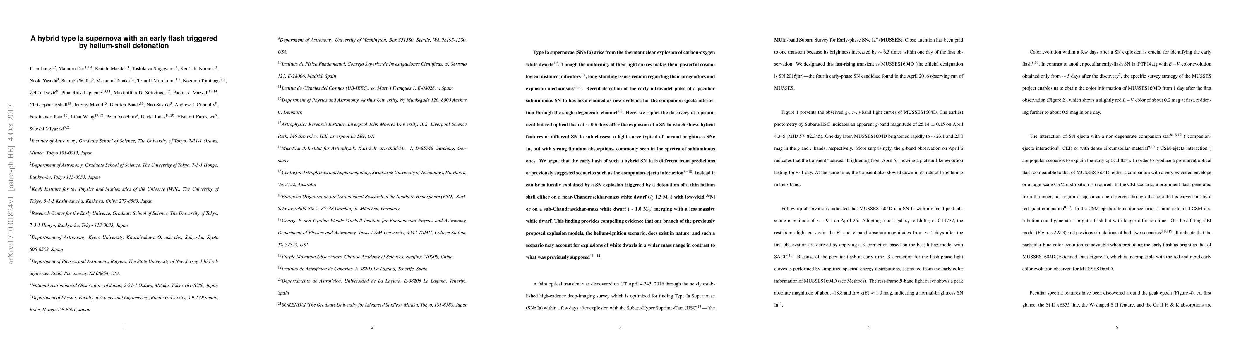 This paper reports a hybrid Type Ia supernova with an early red optical flash, challenging existing models. The flash is attributed to a helium-shell detonation, supporting a broader range of white dwarf masses for such explosions than previously thought.