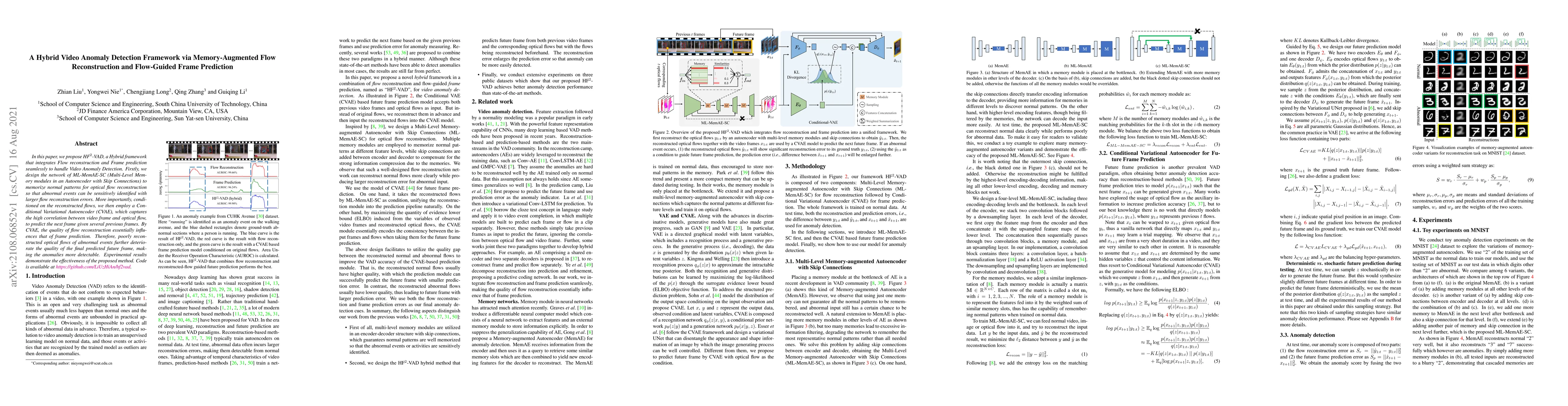 This paper proposes $\text{HF}^2$-VAD, a hybrid framework combining flow reconstruction and frame prediction for video anomaly detection. It uses ML-MemAE-SC for optical flow reconstruction and a CVAE for frame prediction, where poor reconstruction of abnormal flows degrades the predicted frame, enhancing anomaly detection.