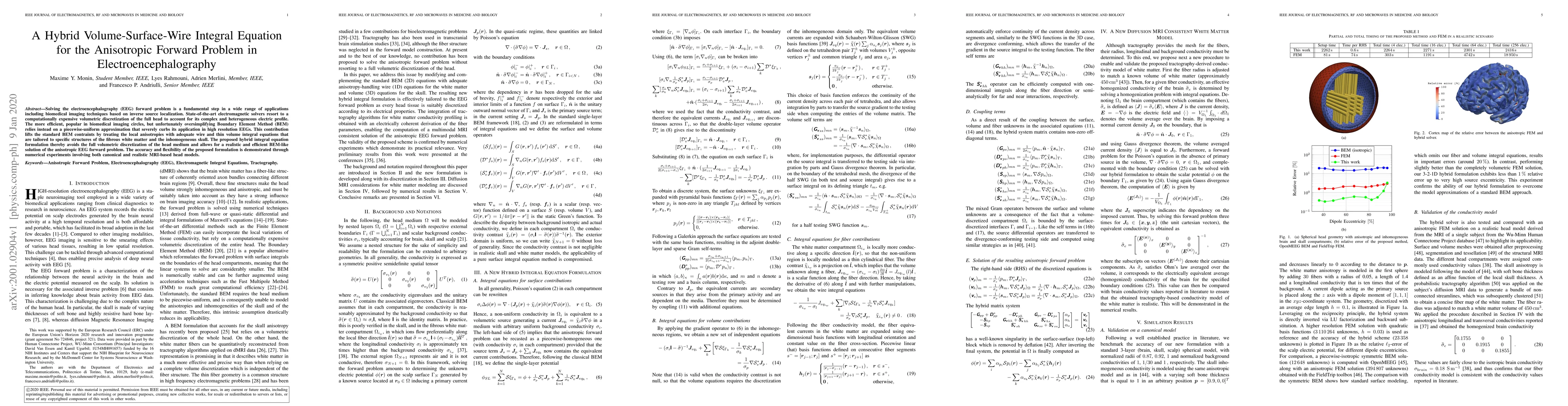 This paper proposes a hybrid volume-surface-wire integral equation to solve the anisotropic EEG forward problem efficiently, avoiding full volumetric discretization. The method combines wire and thin volume integral equations to handle local anisotropies, offering a realistic and accurate alternative to traditional BEM.