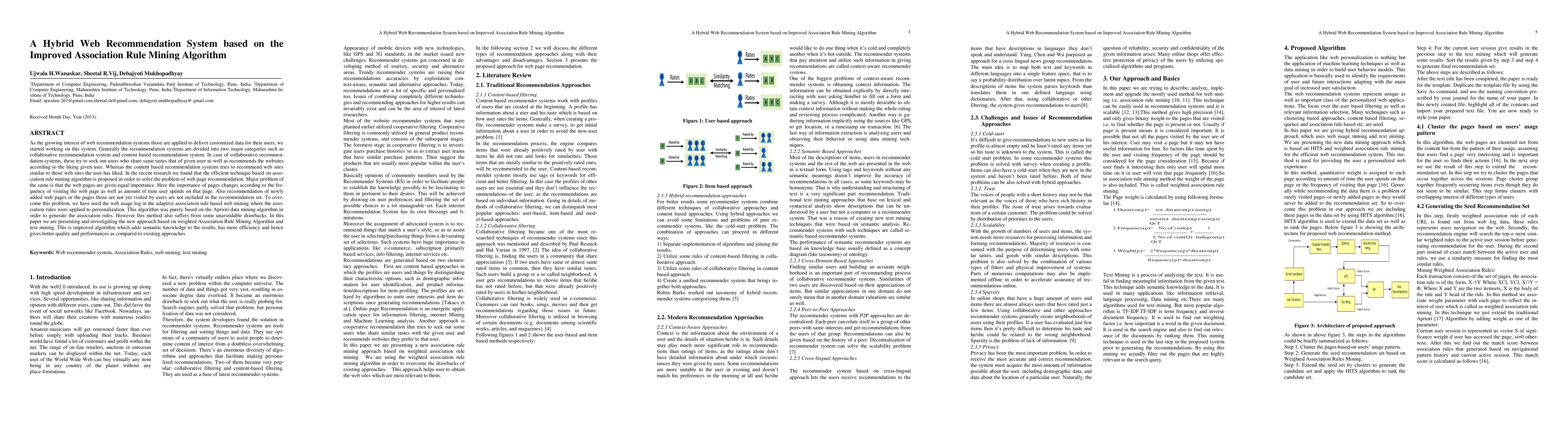The paper presents an improved association rule mining algorithm incorporating page weights and text mining techniques for enhanced web recommendations.