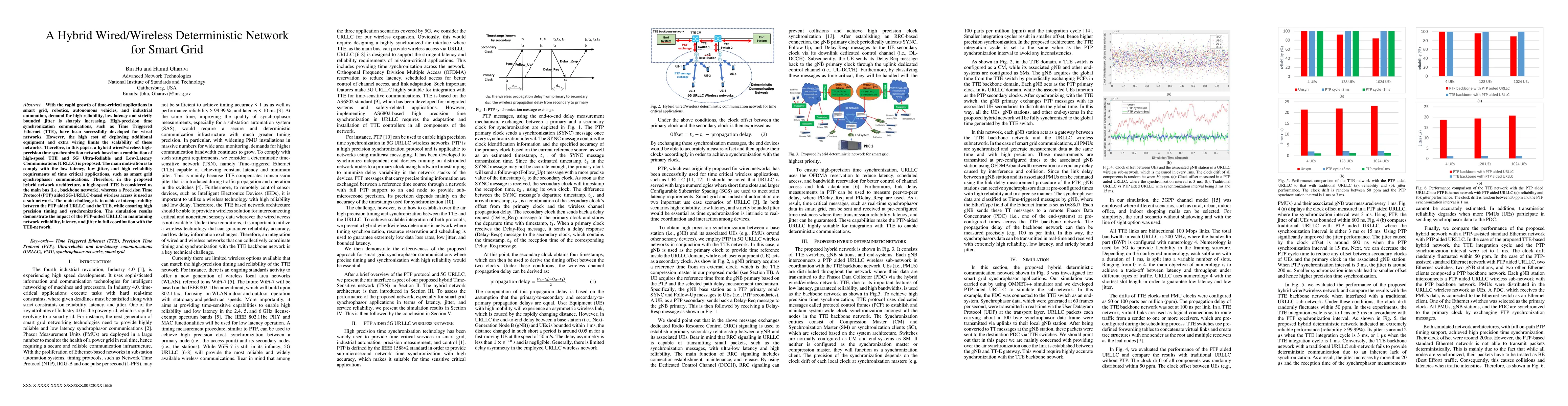 This paper proposes a hybrid wired/wireless deterministic network combining Time Triggered Ethernet (TTE) and 5G Ultra-Reliable and Low-Latency Communications (URLLC) to meet the stringent timing requirements of smart grid applications. The TTE serves as the backbone, while PTP-aided 5G-URLLC provides wireless access, ensuring low latency and high reliability.